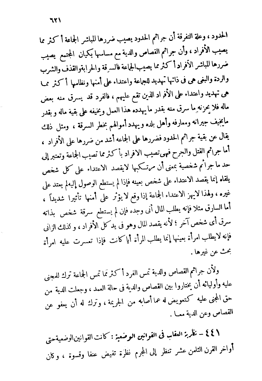 الحدود، وعلة التفرقة أن جرائم الحدود يصيب ضررها المباشر الجماعة أكثر مما يصيب الأفراد، وأن جرائم القصاص والدية مع مساسها بكيان المجتمع يصيب ضررها المباشر الأفراد أكثر مما يصيب الجماعة، فالسرقة والحرابة والقذف والشرب والردة والبغي هي في ذاتها تهديد للجماعة واعتداء عل أمنها ونظامها أكثر مما هي تهديد واعتداء على الأفراد الذين تقع عليهم، فالفرد قد يسرق منه بعض ماله فلا يحزنه ما سرق منه بقدر ما يهدده هذا العمل ويخيفه على بقيه ماله وبقدر ما يخيف جيرانه ومعارفه وأهل بلده ويهدد أموالهم بخطر السرقة، ومثل ذلك يقال عن بقية جرائم الحدود, فضررها على الجماعة أشد من ضررها على الأفراد. أما جرائم القتل والجرح فهي تصيب الأفراد بأكثر مما يصيب الجماعة، وتعتبر إلى حد ما جرائم شخصية، بمعنى أن مرتكبها لا يقصد الاعتداء على كل شخص يلقاه إنما يقصد الاعتداء على شخص بعينه، فإذا لم يستطع الوصول إليه لم يعتد على غيره، ولهذا لا يهز الاعتداء الجماعة فإذا وقع لا يؤثر على أمنها تأثيراً شديداً، أما السارق مثلاً فإنه يطلب المال أنى وجده، فإن لم يستطع سرقة شخص بذاته سرق أي شخص آخر؛ لأنه يقصد المال وهو في يد كل الأفراد، وكذلك الزاني فإنه لا يطلب امرأة بعينها إنما يطلب المرأة أياً كانت، فإذا تعسرت عليه امرأة بحث عن غيرها.