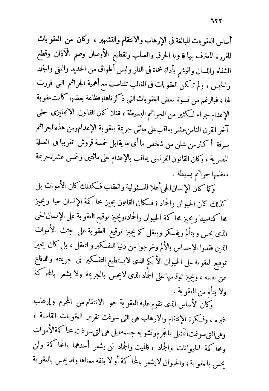 وكما كان الإنسان الحي أهلاً للمسئولية والعقاب فكذلك كان الأموات، بل كذلك كان الحيوان والجماد، فكان القانون يجيز محاكمة الإنسان حياً ويجيز محاكمته ميتاً، ويجيز محاكمة الحيوان والجماد،، ويجيز توقيع العقوبة على الإنسان الحي الذي يحس ويتألم ويفكر ويعقل كما يجيز توقيع على جثث الأموات الذين فقدوا الإحساس بالألم وخرجوا من دنيا التفكير والتعقل، بل كان يجيز توقيع العقوبة على الحيوان الأبكم الذي لا يستطيع التفكير في جريمته والدفاع عن نفسه، ويجيز توقيعها على الجماد الذي لا يحس بالجريمة ولا يشعر بالمحاكمة ولا يتألم من العقوبة.