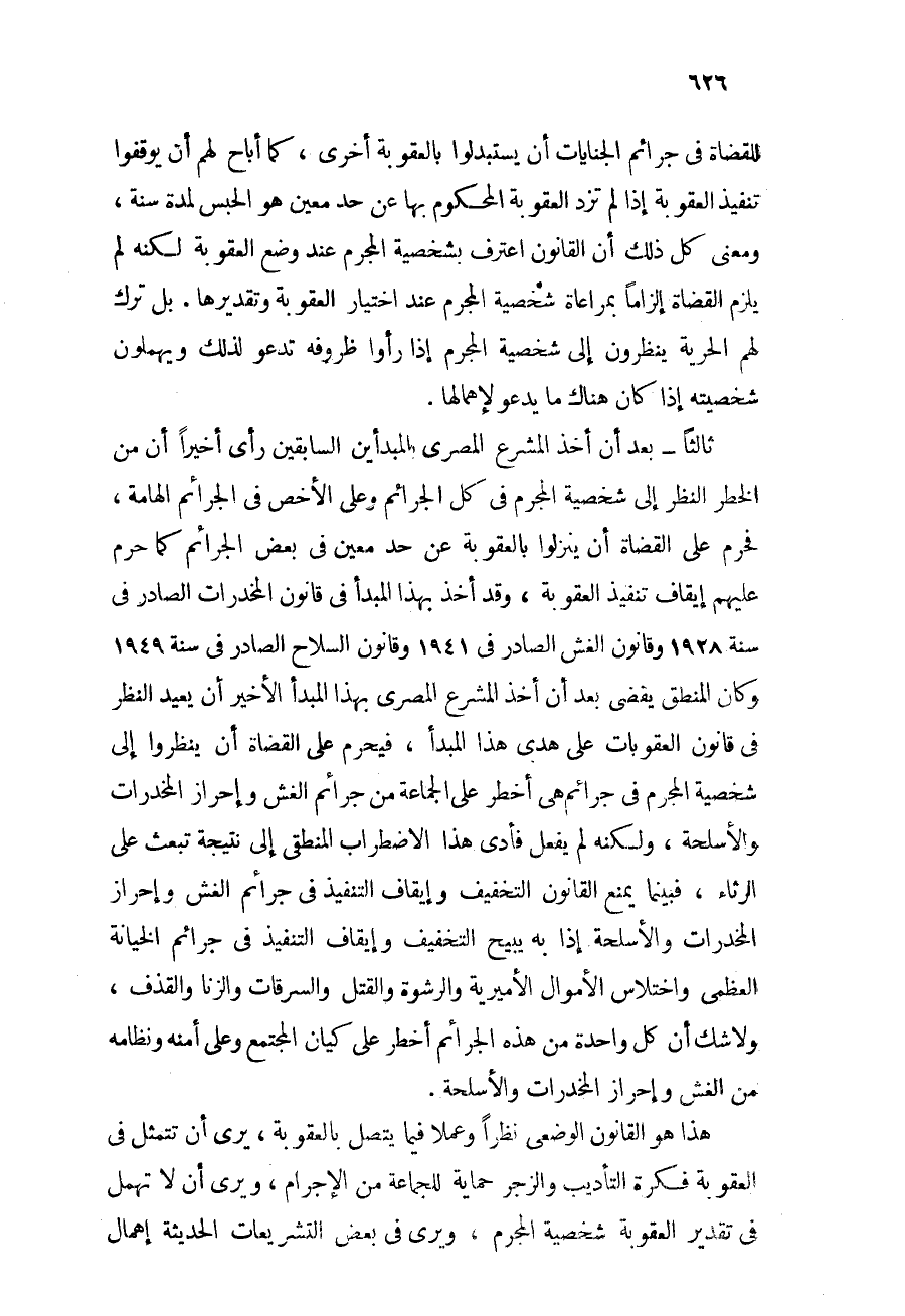 ثالثاً: بعد أن أخذ المشرع المصري بالمبدأين السابقين رأى أخيراً أن من الخطر النظر إلى شخصية المجرم في كل الجرائم وعلى الأخص في الجرائم الهامة، فحرم على القضاة أن ينزلوا بالعقوبة عن حد معين في بعض الجرائم كان حرم عليهم إيقاف تنفيذ العقوبة، وقد أخذ بهذا المبدأ في قانون المخدرات الصادر في سنة 1928، وقانون الغش الصادر في سنة 1941، وقانون السلاح الصادر في سنة 1949، وكان المنطق يقضي بعد أن أخذ المشرع المصري بهذا المبدأ الأخير أن يعيد النظر في قانون العقوبات على هدى هذا المبدأ، فيحرم على القضاة أن ينظروا إلى شخصية المجرم في جرائم هي أخطر على الجماعة من جرائم الغش وإحراز المخدرات والأسلحة، ولكنه لم يفعل، فأدى هذا الاضطراب المنطقي إلى نتيجة تبعث على الرثاء، فبينما يمنع القانون التخفيف وإيقاف التنفيذ في جرائم الغش وإحراز المخدرات والأسلحة إذا به يبيح التخفيف وإيقاف التنفيذ في جرائم الخيانة العظمى واختلاس الأموال الأميرية والرشوة والقتل والسرقات والزنا والقذف, ولا شك أن كل واحدة من هذه الجرائم أخطر من كيان المجتمع وعلى أمنه ونظامه من الغش وإحراز المخدرات والأسلحة.