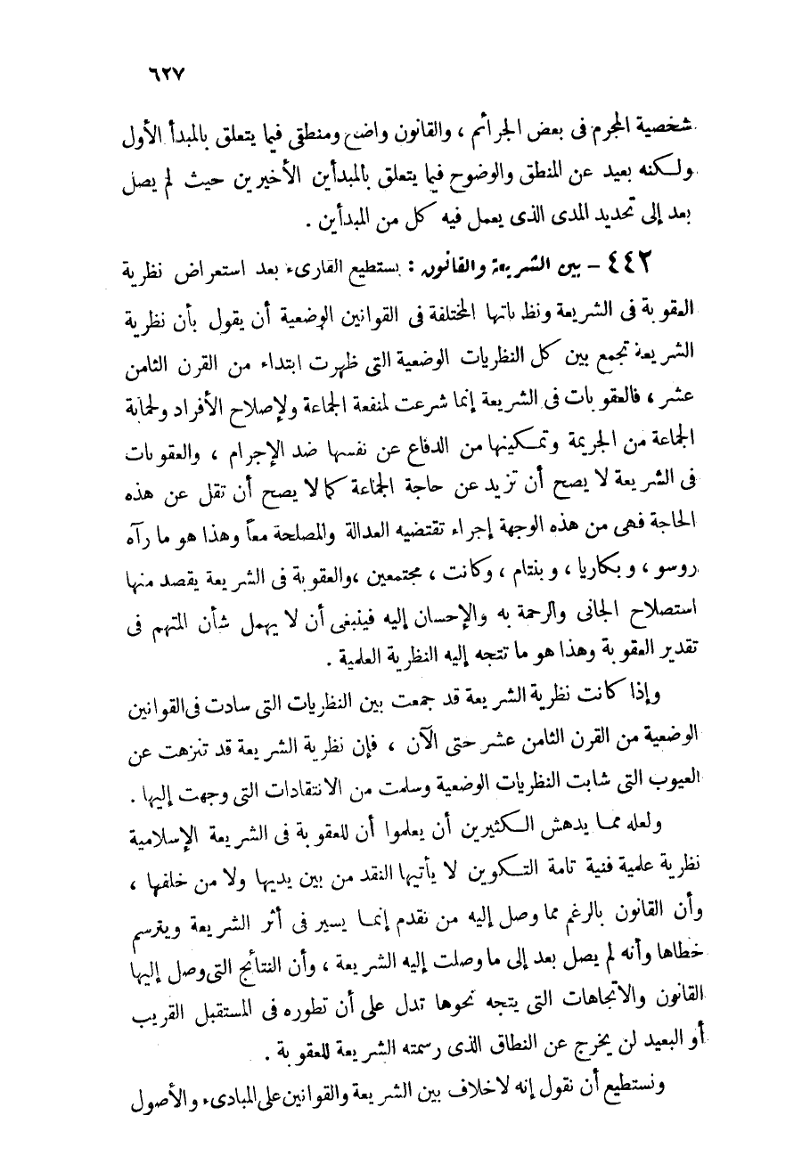 ولعله مما يدهش الكثيرين أن يعلموا أن للعقوبة في الشريعة الإسلامية نظرية علمية فنية تامة التكوين لا يأتيها النقد من بين يدها ولا من خلفها، وأن القانون بالرغم مما وصل إليه من تقدم إنما يسير في أثر الشريعة ويترسم خطاها، وأنه لم يصل بعد إلى ما وصلت إليه الشريعة، وأن النتائج التي وصل إليها القانون والاتجاهات التي يتجه نحوها تدل على أن تطوره في المستقبل القريب أو البعيد لن يخرج عن النطاق الذي رسمته الشريعة للعقوبة.