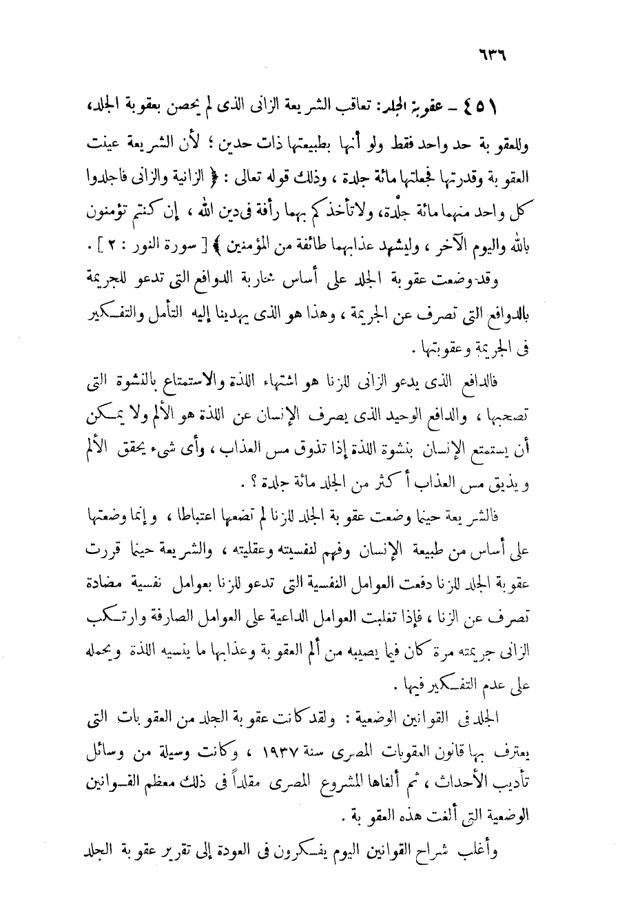 فالشريعة حينما وضعت عقوبة الجلد للزنا لم تضعها اعتباطاً، وإنما وضعتها على أساس من طبيعة الإنسان وفهم لنفسيته وعقليته، والشريعة حينما قررت عقوبة الجلد للزنا دفعت العوامل النفسية التي تدعو للزنا بعوامل نفسية مضادة تصرف عن الزنا، فإذا تغلبت العوامل الداعية على العوامل الصارفة وارتكب الزاني جريمته مرة كان فيما يصيبه من ألم العقوبة وعذابها ما ينسيه اللذة ويحمله على عدم التفكير فيها. ...