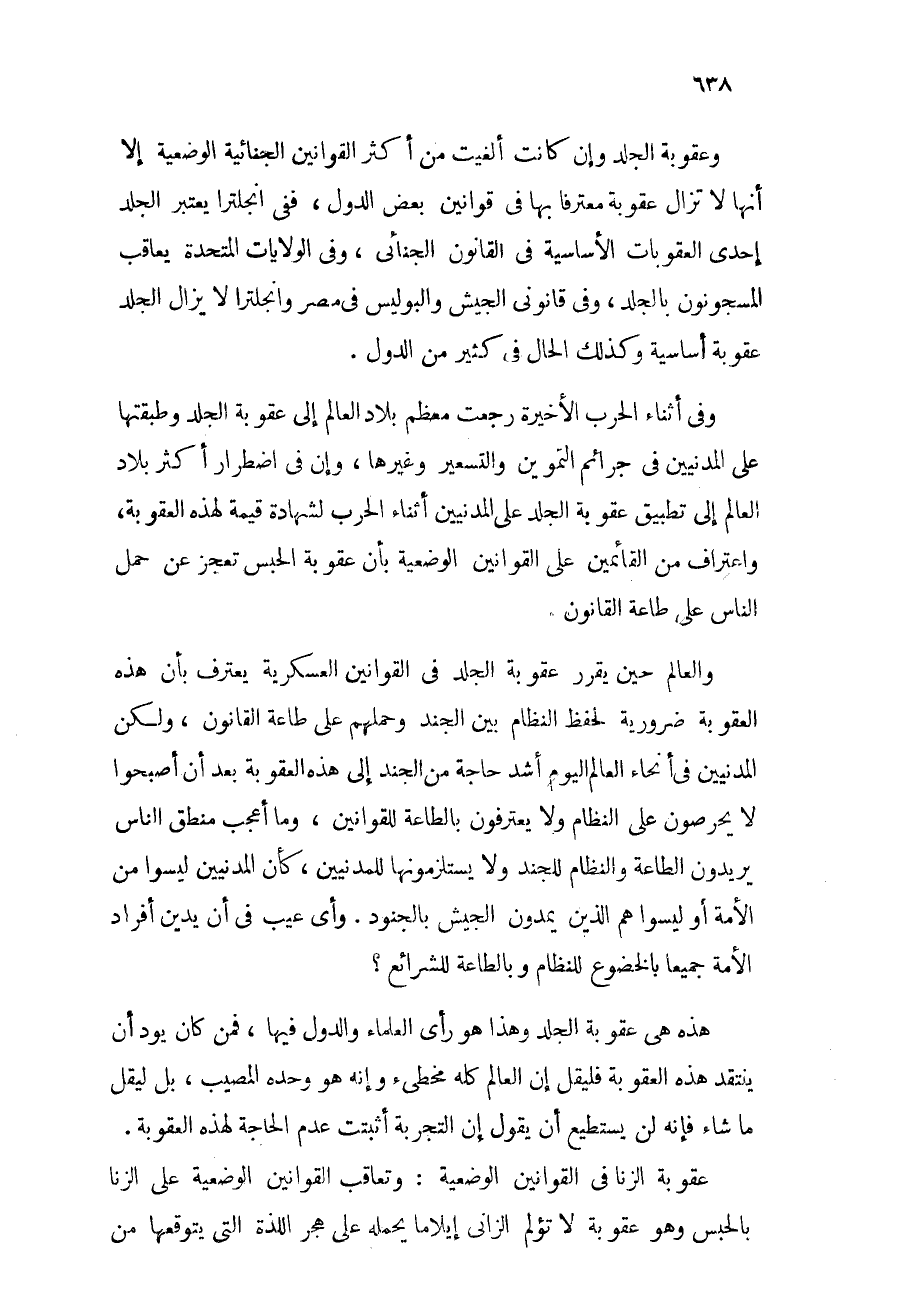 وفي أثناء الحرب الأخيرة رجعت معظم بلاد العالم إلى عقوبة الجلد وطبقتها على المدنيين في جرائم التموين والتسعير وغيرها، وإن في اضطرار أكثر بلاد العالم إلى تطبيق عقوبة الجلد على المدنيين أثناء الحرب لشهادة قيمة لهذه العقوبة، واعترافاً من القائمين على القوانين الوضعية بأن عقوبة الحبس تعجز عن حمل الناس على طاعة القانون.