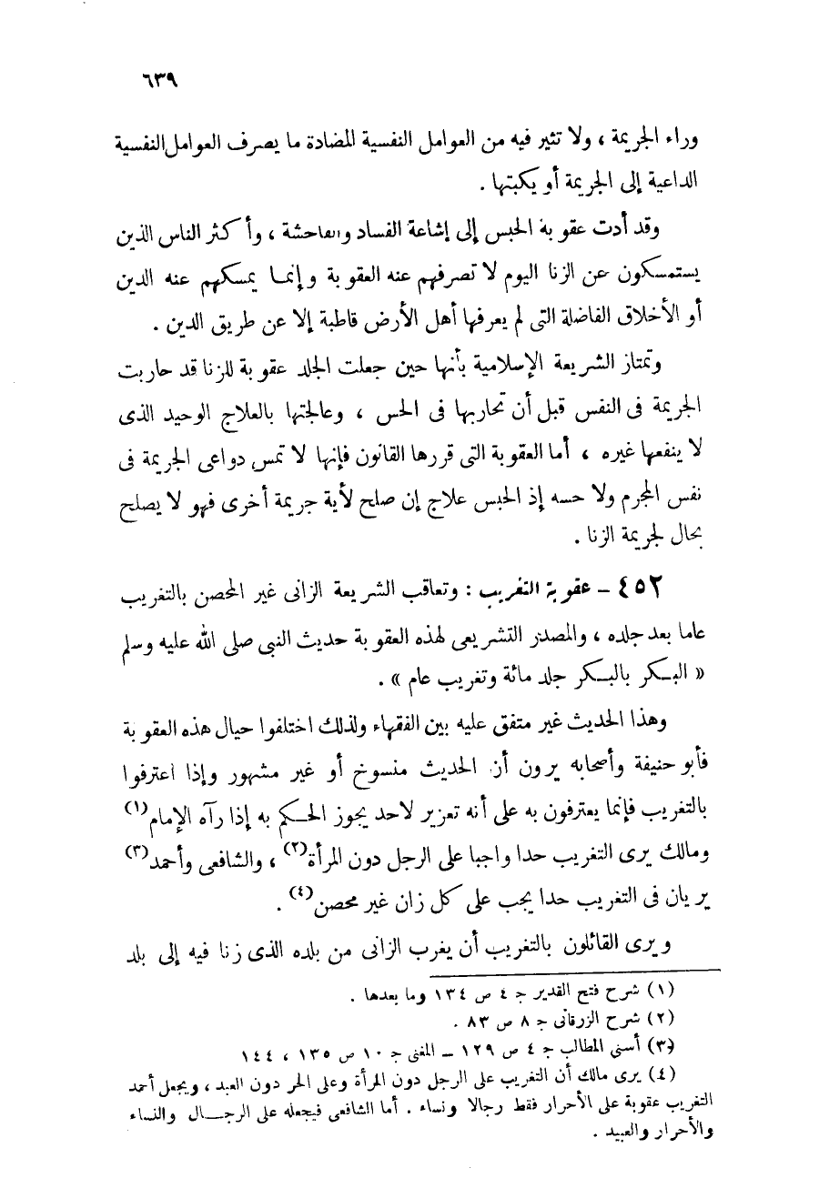 452 - عقوبة التغريب: وتعاقب الشريعة الزاني غير المحصن بالتغريب عاماً بعد جلده، والمصدر التشريعي لهذه العقوبة حديث النبي - صلى الله عليه وسلم -: "البكر بالبكر جلد مائة وتغريب عام".