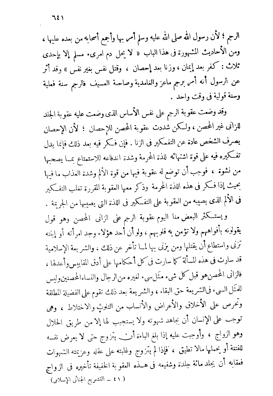ويستكبر البعض منا اليوم عقوبة الرجم على الزاني المحصن، وهو قول يقولونه بأفواههم ولا يؤمن به قلوبهم، ولو أن أحد هؤلاء وجد امرأته أو ابنته تزني واستطاع أن يقتلها ومن يزني بها لما تأخر عن ذلك. والشريعة الإسلامية قد سارت في هذه المسألة كما سارت في كل أحكامها على أدق المقاييس وأعدلها، فالزاني المحصن هو قبل كل شيء مثل سيئ لغيره من الرجال والنساء المحصنين وليس للمثل السيئ في الشريعة حق البقاء, والشريعة بعد ذلك تقوم على الفضيلة المطلقة وتحرص على الأخلاق والأعراض والأنساب من التلوث والاختلاط، وهي توجب على الإنسان أن يجاهد شهوته ولا يستجيب لها إلا من طريق الحلال وهو الزواج، وأوجبت عليه إذا بلغ الباءة أن يتزوج حتى لا يعرض نفسه للفتنة أو يحملها ما لا تطيق, فإذا لم يتزوج وغلبته على عقله وعزيمته الشهوات فعقابه أن يجلد مائة جلدة، وشفيعه في هذه العقوبة الخفيفة تأخيره في الزواج