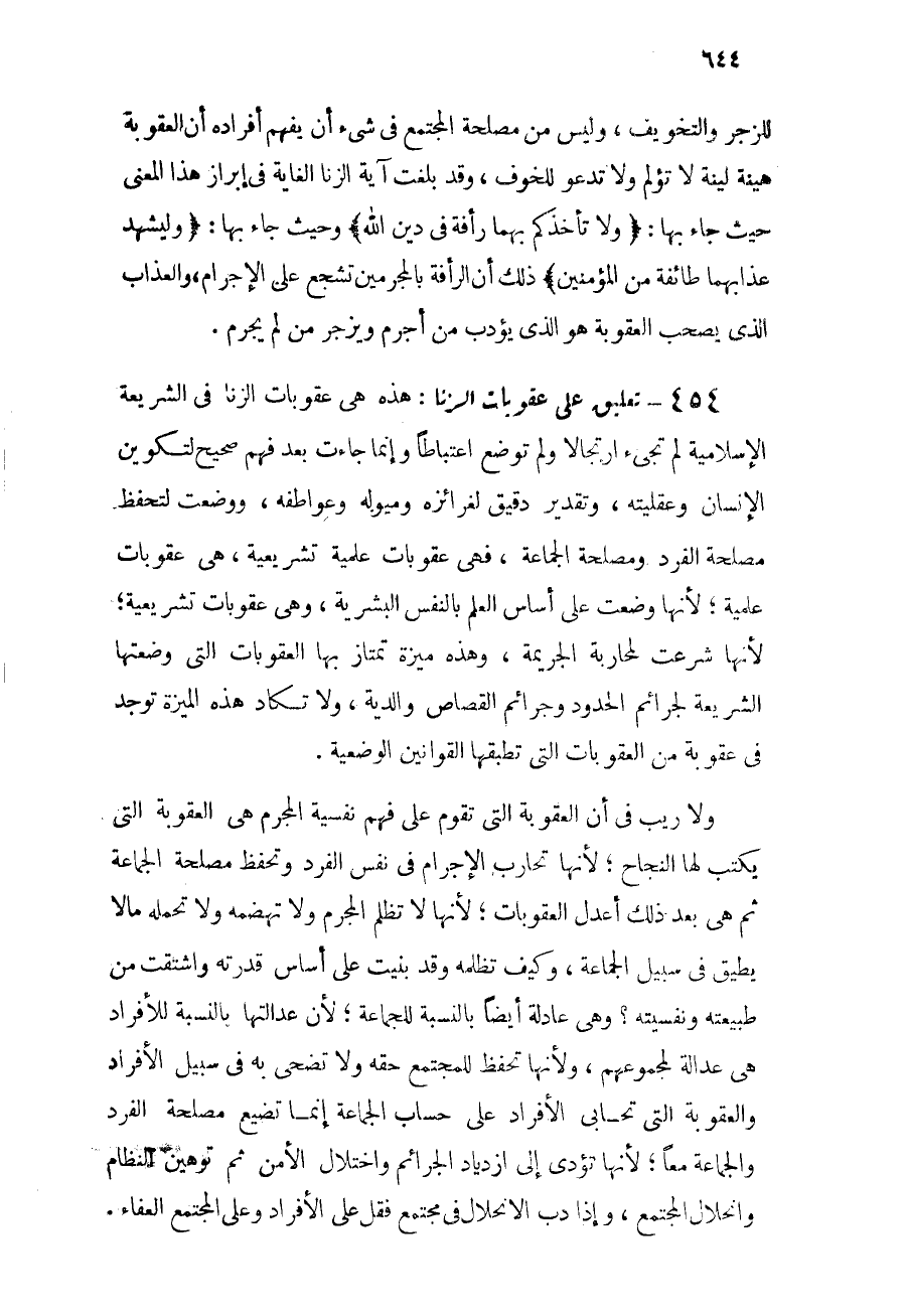 454 - تعليق على عقوبات الزنا: هذه هي عقوبات الزنا في الشريعة الإسلامية, لم تجئ إرتجالاً ولم توضع اعتباطاً وإنما جاءت بعد فهم صحيح لتكوين الإنسان وعقليته، وتقدير دقيق لغرائزه وميوله وعواطفه، ووضعت لتحفظ مصلحة الفرد ومصلحة الجماعة، فهي عقوبات علمية تشريعية؛ لأنها شرعت لمحاربة الجريمة، وهذه ميزة تمتاز بها العقوبات التي وضعتها الشريعة لجرائم الحدود وجرائم القصاص والدية, ولا تكاد هذه الميزة توجد في عقوبة من العقوبات التي تطبقها القوانين الوضعية.