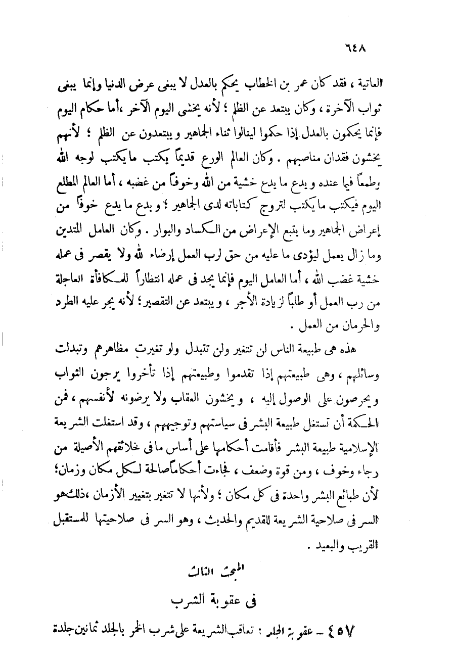 العاتية، فقد كان عمر بن الخطاب يحكم بالعدل لا يبغي عرض الدنيا وإنما يبغي ثواب الآخرة, وكان يبتعد عن الظلم؛ لأنه يخشى اليوم الآخر، أما حكام اليوم فإنما يحكمون بالعدل إذا حكموا لينالوا ثناء الجماهير، ويبتعدون عن الظلم لأنهم يخشون فقدان مناصبهم.