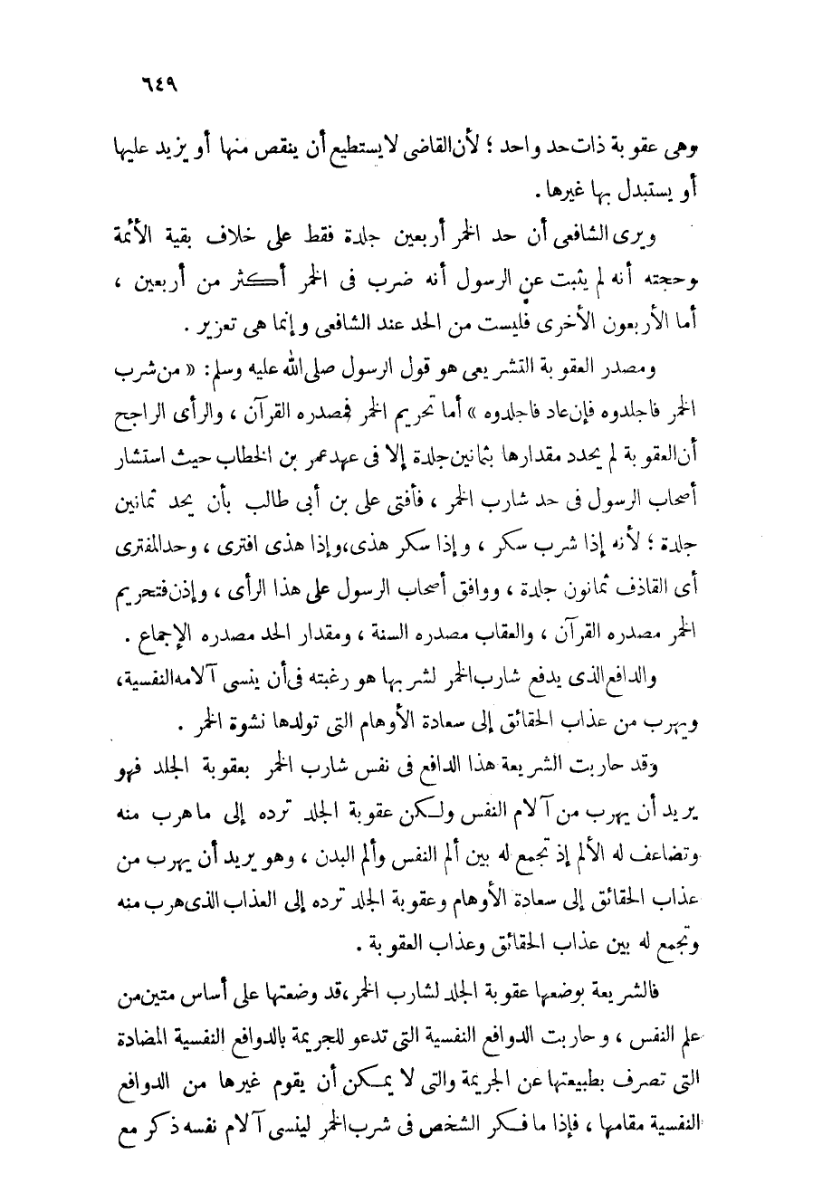 وقد حاربت الشريعة هذا الدافع في نفس شارب الخمر بعقوبة الجلد, فهو يريد أن يهرب من آلام النفس ولكن عقوبة الجلد ترده إلى ما هرب منه وتضاعف له الألم إذ تجمع له بين ألم النفس وألم البدن, وهو يريد أن يهرب من عذاب الحقائق إلى سعادة الأوهام وعقوبة الجلد تروه إلى العذاب الذي هرب منه وتجمع له بين عذاب الحقائق وعذاب العقوبة.