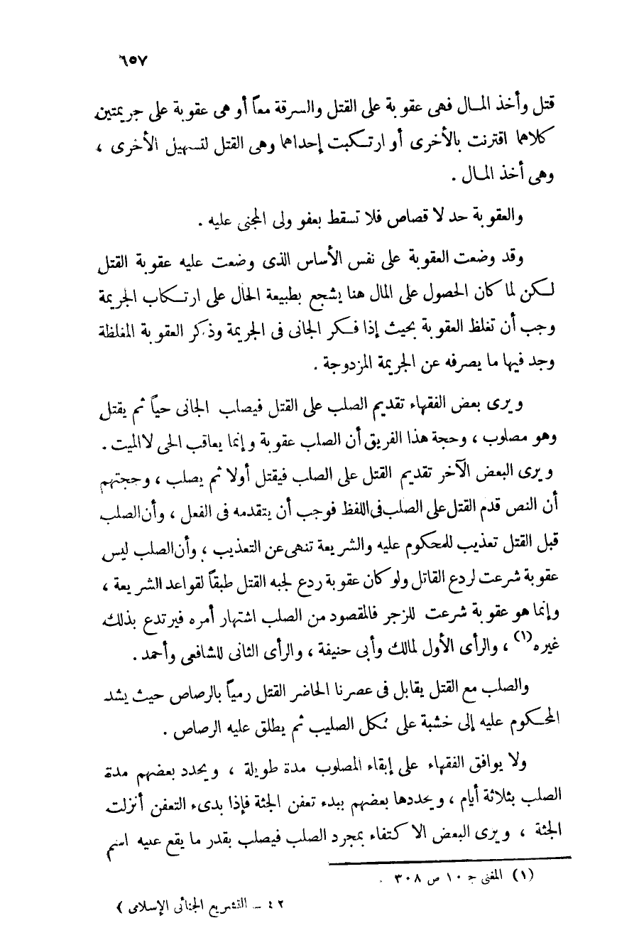 ويرى بعض الفقهاء تقديم الصلب على القتل، فيصلب الجاني حياً ثم يقتل وهو مصلوب، وحجة هذا الفريق أن الصلب عقوبة وإنما يعاقب الحي لا الميت. ويرى البعض الآخر تقديم القتل على الصلب فيقتل أولاً ثم يصلب، وحجتهم أن النص قدم القتل على الصلب في اللفظ فوجب أن يتقدمه في الفعل، وأن الصلب قبل القتل تعذيب للمحكوم عليه والشريعة تنهي عن التعذيب، وأن الصلب ليس عقوبة شرعت لردع القاتل ولو كان عقوبة ردع لجبه القتل طبقاً لقواعد الشريعة، وإنما هو عقوبة شرعت للزجر فالمقصود من الصلب اشتهار أمره فيرتدع بذلك غيره (¬1) ، والرأي الأول لمالك وأبي حنيفة، والرأي الثاني للشافعي وأحمد.