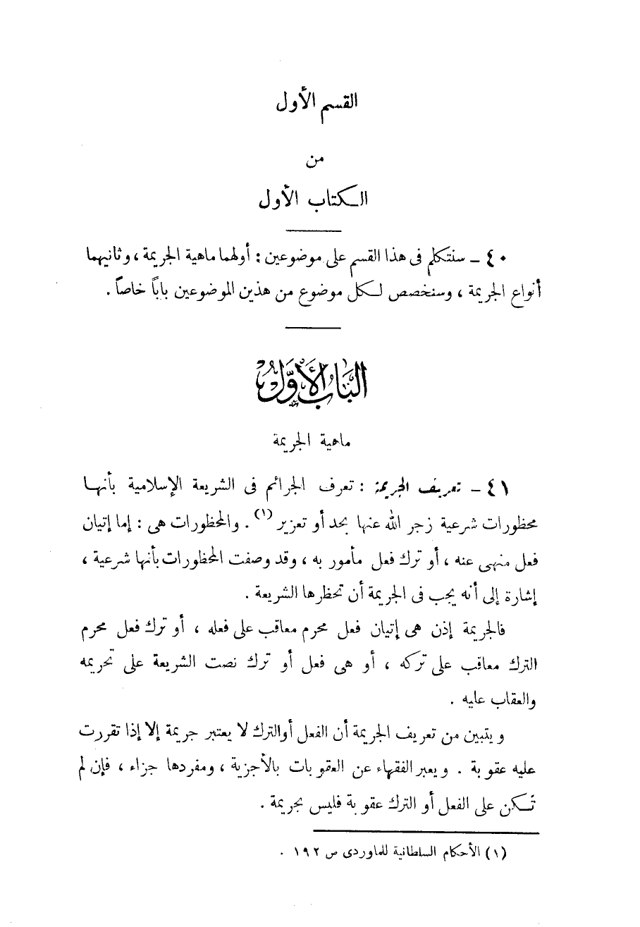 40 - سنتكلم في هذا القسم على موضوعين: أولهما: ماهية الجريمة، وثانيهما: أنواع الجريمة، وسنخصص لكل موضوع من هذين الموضوعين باباً خاصاً.