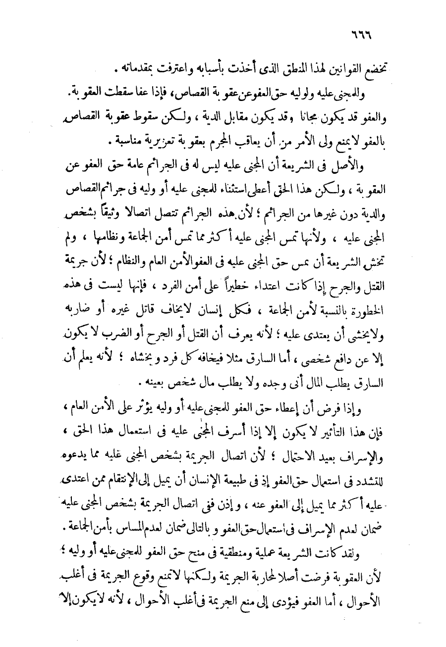 وإذا فرض أن إعطاء حق العفو للمجني عليه أو وليه يؤثر على الأمن العام, فإن هذا التأثير لا يكون إلا إذا أسرف المجني عليه في استعمال هذا الحق, والإسراف بعيد الاحتمال؛ لأن اتصال الجريمة بشخص المجني عليه مما يدعوه للتشدد في استعمال حق العفو عنه، وإذن ففي اتصال الجريمة بشخص المجني عليه ضمان لعدم الإسراف في استعمال حق العفو, وبالتالي ضمان لعدم المساس بأمن الجماعة.