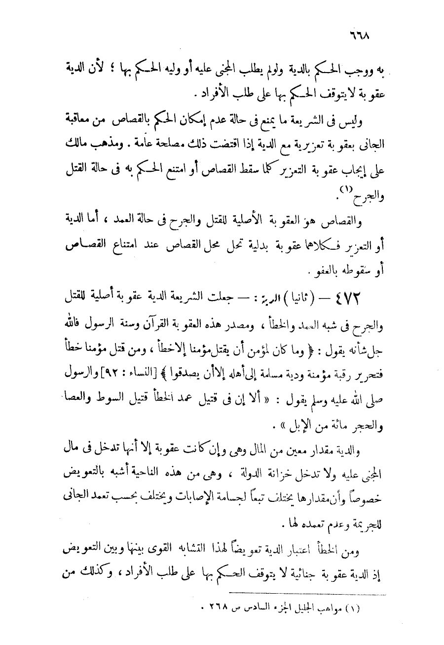 472 - (ثانياً) : الدية: جعلت الشريعة الدية عقوبة أصلية للقتل والجرح في شبه العمد والخطأ، ومصدر هذه العقوبة القرآن وسنة الرسول - صلى الله عليه وسلم -, فالله جل شأنه يقول: {وَمَا كَانَ لِمُؤْمِنٍ أَن يَقْتُلَ مُؤْمِنًا إِلاَّ خَطَئًا وَمَن قَتَلَ مُؤْمِنًا خَطَئًا فَتَحْرِيرُ رَقَبَةٍ مُّؤْمِنَةٍ وَدِيَةٌ مُّسَلَّمَةٌ إِلَى أَهْلِهِ إِلاَّ أَن يَصَّدَّقُواْ} [النساء: 92] , والرسول - صلى الله عليه وسلم - يقول: "ألا إن في قتيل عمد الخطأ قتيل السوط والعصا والحجر مائة من الإبل".