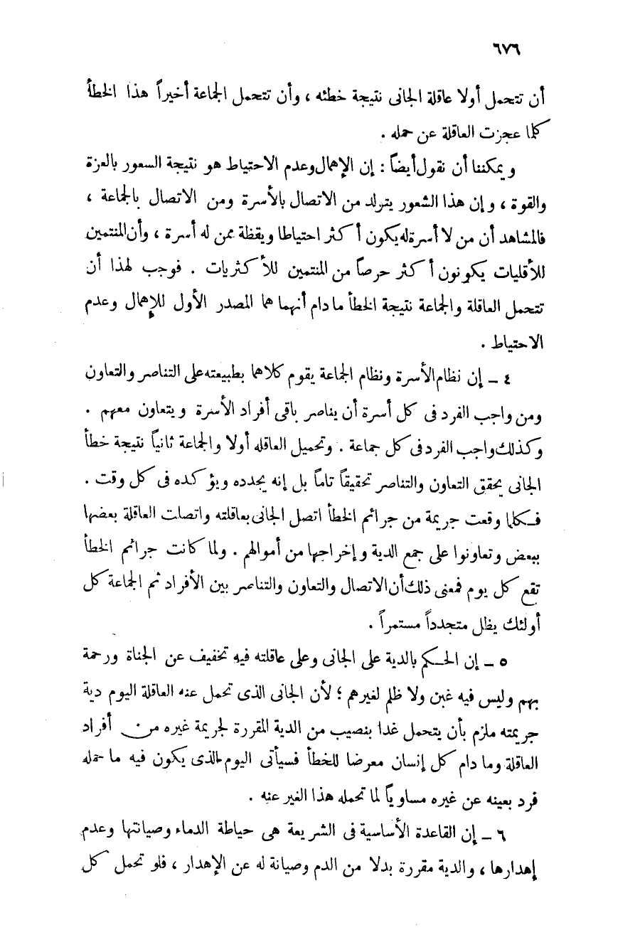4 - إن نظام الأسرة ونظام الجماعة يقوم كلاهما بطبيعته على التناصر والتعاون ومن واجب الفرد في كل أسرة أن يناصر باقي أفراد الأسرة ويتعاون معهم. وكذلك واجب الفرد في كل جماعة. وتحميل العاقلة أولاً والجماعة ثانياً نتيجة خطأ الجاني يحقق التعاون والتناصر تحقيقاً تاماً, بل أنه يجدده ويؤكده في كل وقت. فكلما وقعت جريمة من جرائم الخطأ اتصل الجاني بعاقلته واتصلت العاقلة بعضها ببعض وتعاونوا على جمع الدية وإخراجها من أموالهم. ولما كانت جرائم الخطأ تقع كل يوم فمعنى ذلك أن الاتصال والتعاون والتناصر بين الأفراد ثم الجماعة كل أولئك يظل متجدداً مستمراً.