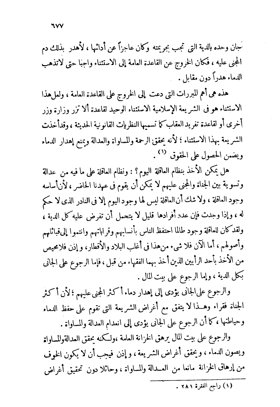 والرجوع على بيت المال يرهق الخزانة العامة, ولكنه يحقق العدالة والمساواة، ويصون الدماء, ويحقق أغراض الشريعة, وإذن يجب أن لا يكون الخوف من إرهاق الخزنة مانعاً من العدالة والمساواة, وحائلاً دون تحقيق أغراض