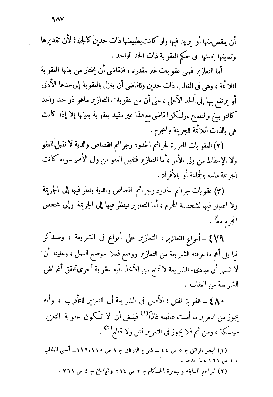 479 - أنواع التعازير: التعازير على أنواع في الشريعة، وسنذكر فيما يلي أهم ما عرفته الشريعة من التعازير ووضع فعلاً موضع العمل، وعلينا أن لا ننسى أن مبادئ الشريعة لا تمنع من الأخذ بأية عقوبة أخرى تحقق أغراض الشريعة من العقاب.