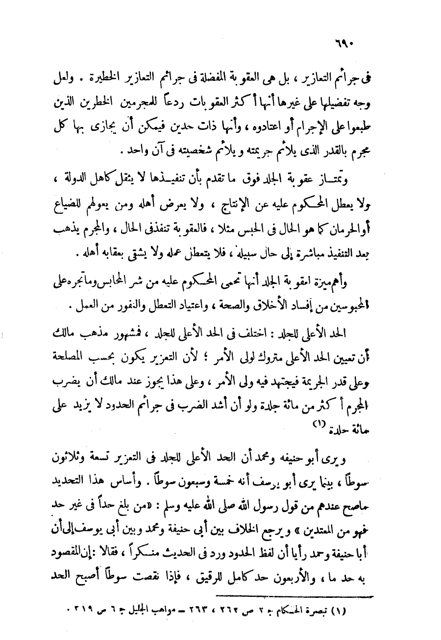 الحد الأعلى للجلد: اختلف في الحد الأعلى للجلد، فمشهور مذهب مالك أن تعيين الحد الأعلى متروك لولي الأمر؛ لأن التعزير يكون بحسب المصلحة وعلى قدر الجريمة فيجتهد فيه ولي الأمر، وعلى هذا يجوز عند مالك أن يضرب المجرم أكثر من مائة جلدة ولو أن أشد الضرب في جرائم الحدود لا يزيد على مائة جلدة (¬1) .