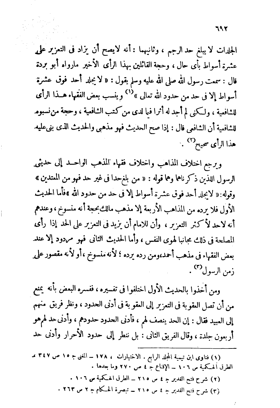 ويرجع اختلاف المذاهب واختلاف فقهاء المذهب الواحد إلى حديثي الرسول - صلى الله عليه وسلم - اللذين ذكرناهما وهما قوله: "من بلغ حداً في غير حد فهو من المعتدين"، وقوله: "لا يجلد أحد فوق عشرة أسواط إلا في حد من حدود الله", فأما الحديث الأول فلا يرده من المذاهب الأربعة إلا مذهب مالك بحجة أنه منسوخ، وعندهم أنه لا حد لأكثر التعزير، وأن للإمام أن يزيد في التعزير على الحد إذا رأى المصلحة في ذلك مجانباً لهوى النفس, وأما الحديث الثاني فهو مردود إلا عند بعض الفقهاء في مذهب أحمد, ومن رده يرده لأنه منسوخ، أو لأنه مقصور على زمن الرسول الله - صلى الله عليه وسلم - (¬3) .