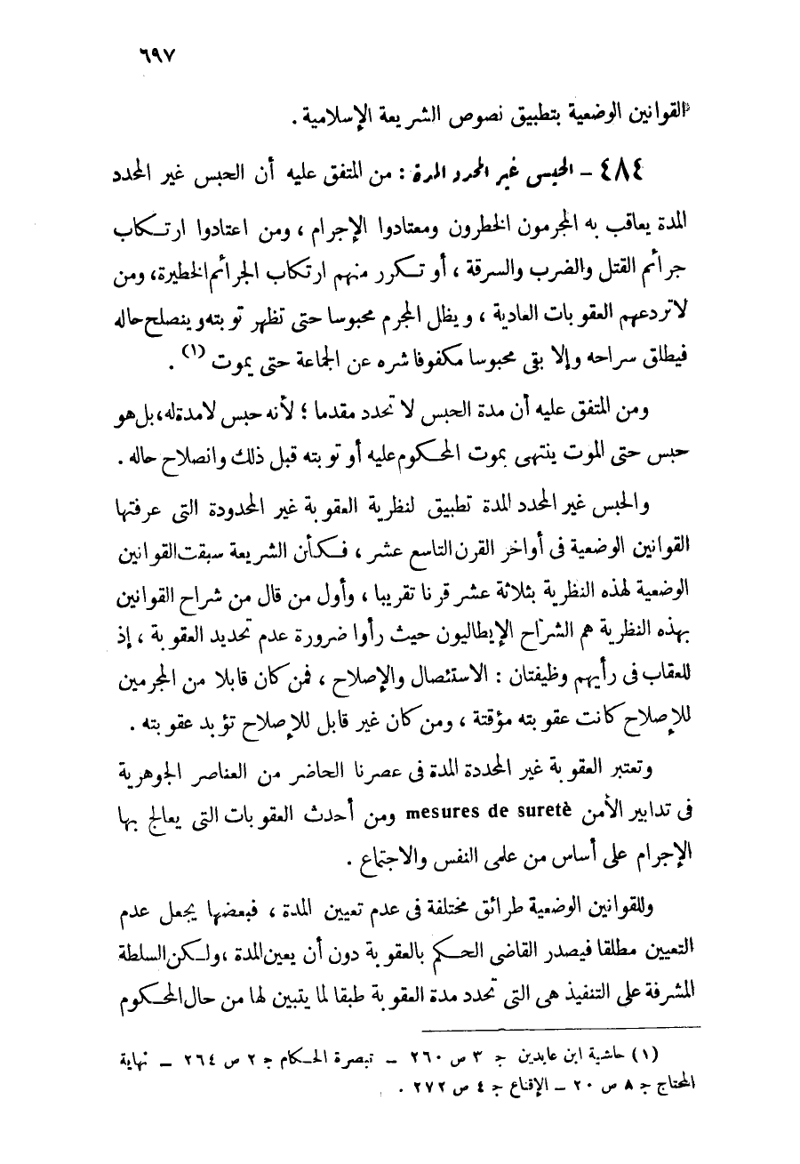 484 - الحبس غير محدد المدة: من المتفق عليه أن الحبس غير المحدد المدة يعاقب به المجرمون الخطرون ومعتادو الإجرام, ومن اعتادوا ارتكاب جرائم القتل والضرب والسرقة، أو تكرر منهم ارتكاب الجرائم الخطيرة، ومن لا تردعهم العقوبات العادية، ويظل المجرم محبوساً حتى تظهر توبته وينصلح حاله فيطلق سراحه وإلا بقى محبوساً مكفوفاً شره عن الجماعة حتى يموت (¬1) .