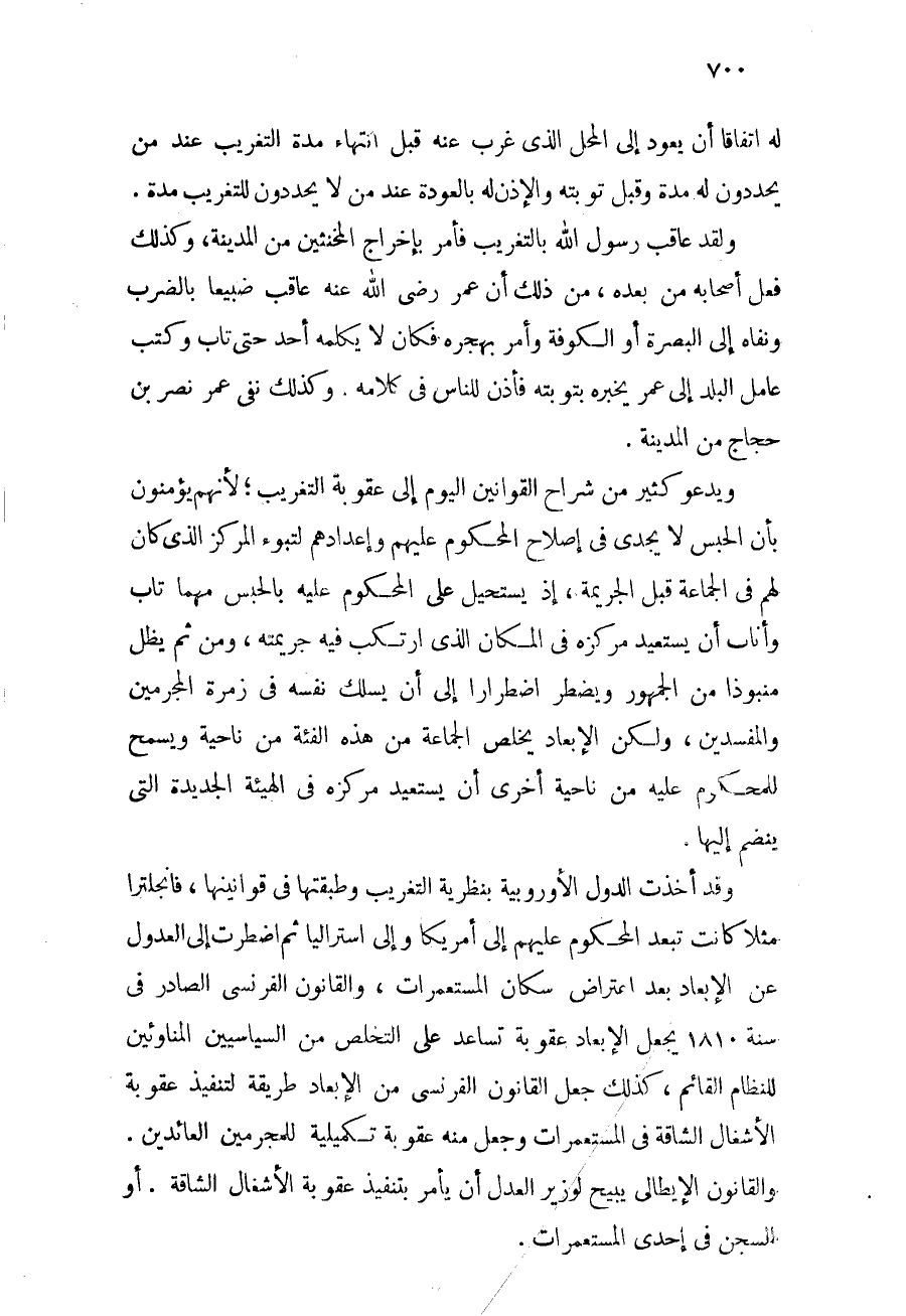 له اتفاقاً أن يعود إلى المحل الذي غرب عنه قبل انتهاء مدة التغريبعند من يحددون له مدة وقبل توبته والإذن له بالعودة عند من يحددون للغريب مدة. ولقد عاقب رسول الله - صلى الله عليه وسلم - بالتغريب فأمر بإخراج المخنثين من المدينة, وكذلك فعل أصحابه من بعده, ومن ذلك أن عمر رضي الله عنه عاقب ضبيعاً بالضرب ونفاه إلى البصرة أو الكوفة وأمر بهجرته فكان لا يكلمه أحد حتى تاب, وكتب عامل البلد إلى عمر يخبره بتوبته فأذن للناس في كلامه. وكذلك نفى عمر نصر بن حجاج من المدينة.