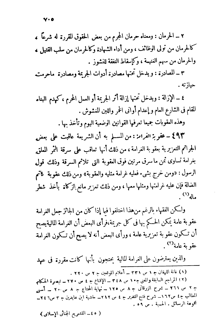 493 - عقوبة الغرامة: من المسلم به أن الشريعة عاقبت على بعض الجرائم التعزيرية بعقوبة الغرامة, من ذلك أنها تعاقب على سرقة الثمر المعلق بغرامة تساوي ثمن ما سرق مرتين فوق العقوبة التي تلائم السرقة, وذلك قول الرسول - صلى الله عليه وسلم -: "ومن خرج بشئ فعليه غرامة مثليه والعقوبة", ومن ذلك عقوبة كاتم الضالة فإن عليه غرامتها ومثلها معها, ومن ذلك تعزير مانع الزكاة بأخذ شطر ماله (¬1) .
