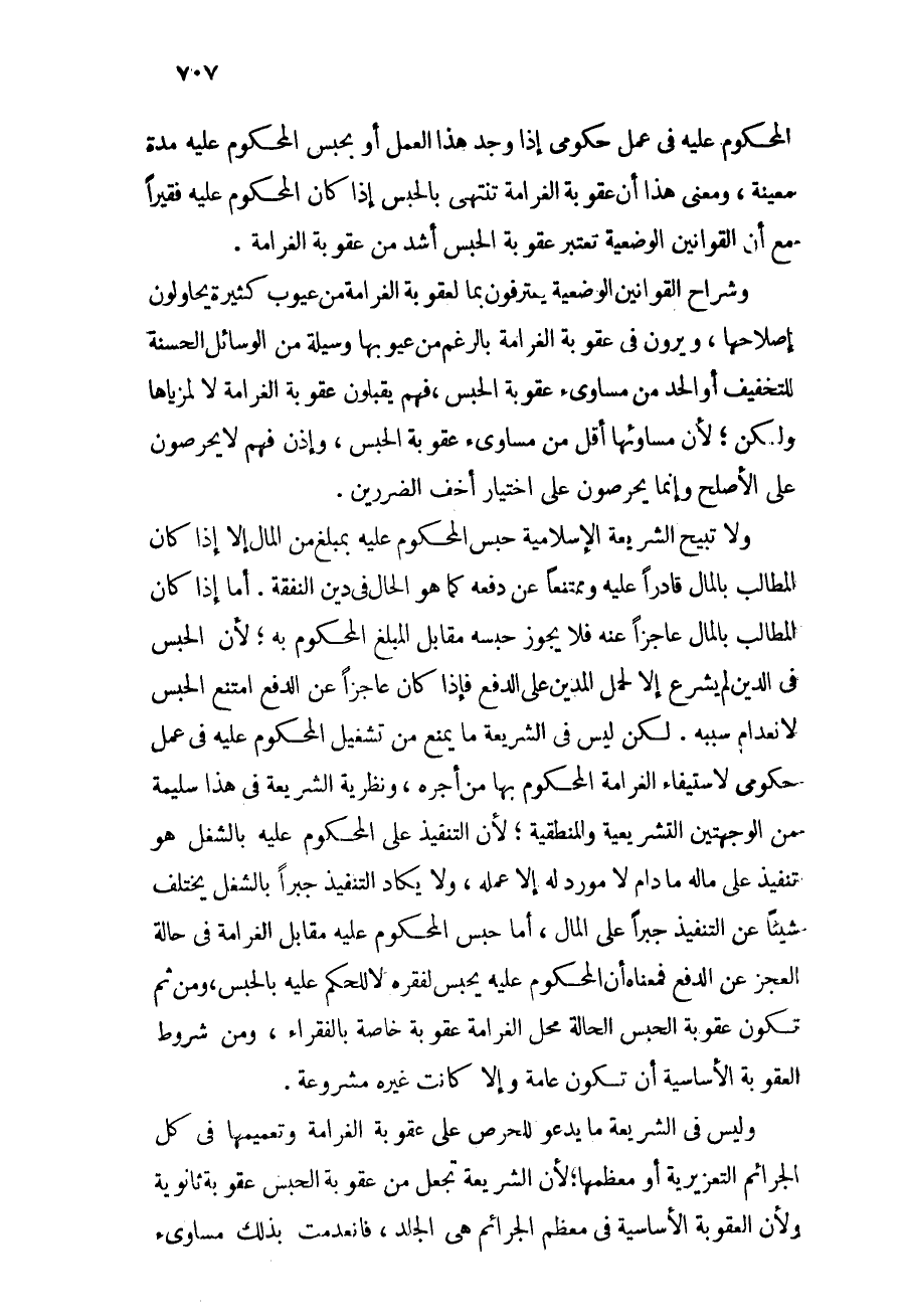 ولا تبيح الشريعة الإسلامية حبس المحكوم عليه بمبلغ من المال إلا إذا كان المطالب بالمال قادراً عليه وممتنعاً عن دفعه كما هو الحال في دين النفقة. أما إذا كان المطالب بالمال قادراً عنه فلا يجوز حبسه مقابل المبلغ المحكوم به؛ لأن الحبس في الدين لم يشرع إلا لحمل المدين على الدفع فإذا كان عاجزاً عن الدفع امتنع الحبس لانعدام سببه. ولكن ليس في الشريعة ما يمنع من تشغيل المحكوم عليه في عمل حكومي لاستيفاء الغرامة المحكوم بها من أجره, ونظرية الشريعة في هذا سليمة من الوجهين التشريعية والمنطقية؛ لأن التنفيذ على المحكوم عليه بالشغل هو التنفيذ على ماله ما دام لا مورد له إلا عمله, ولا يكاد التنفيذ جبراً بالشغل يختلف شيئاً عن التنفيذ جبراً على المال, أما حبس المحكوم عليه مقابل الغرامة في حالة العجز عن الدفع فمعناه أن المحكوم عليه يحبس لفقره لا للحكم بالحبس, ومن ثم تكون عقوبة الحبس الحالة محل الغرامة عقوبة خاصة بالفقراء, ومن شروط العقوبة الأساسية أن تكون عامة وإلا كانت غيره مشروعة.