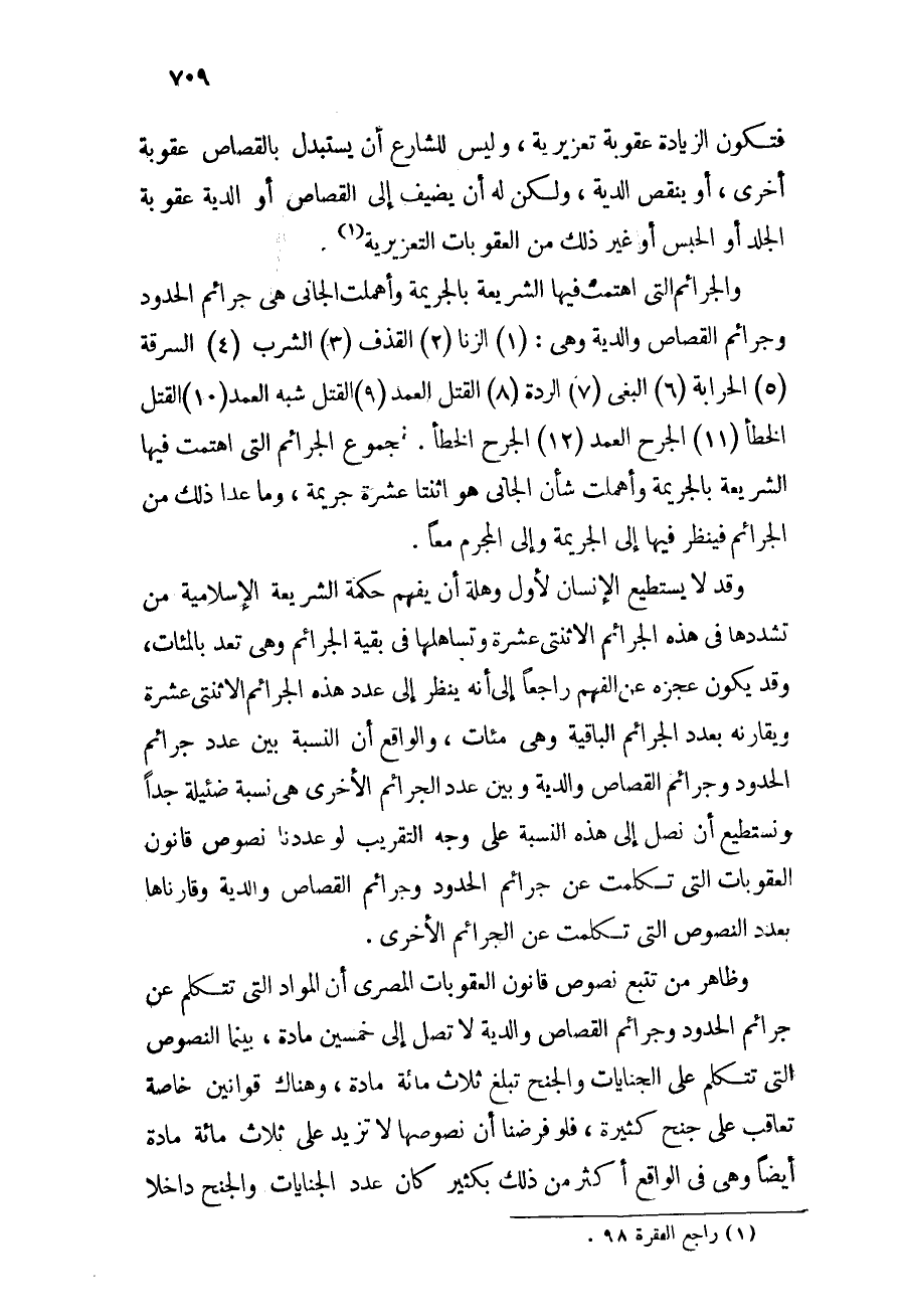 وظاهر من تتبع نصوص قانون العقوبات المصري أن المواد التي تتكلم عن جرائم الحدود وجرائم القصاص والدية لا تصل إلى خمسين مادة، بينما النصوص التي تتكلم عن الجنايات والجنح تبلغ ثلاثمائة مادة، وهناك قوانين خاصة تعاقب على جنح كثيرة، فلو فرضنا أن نصوصها لا تزيد على ثلاثمائة مادة أيضاً وهي في الواقع أكثر من ذلك بكثير كان عدد الجنايات والجنح داخلاً