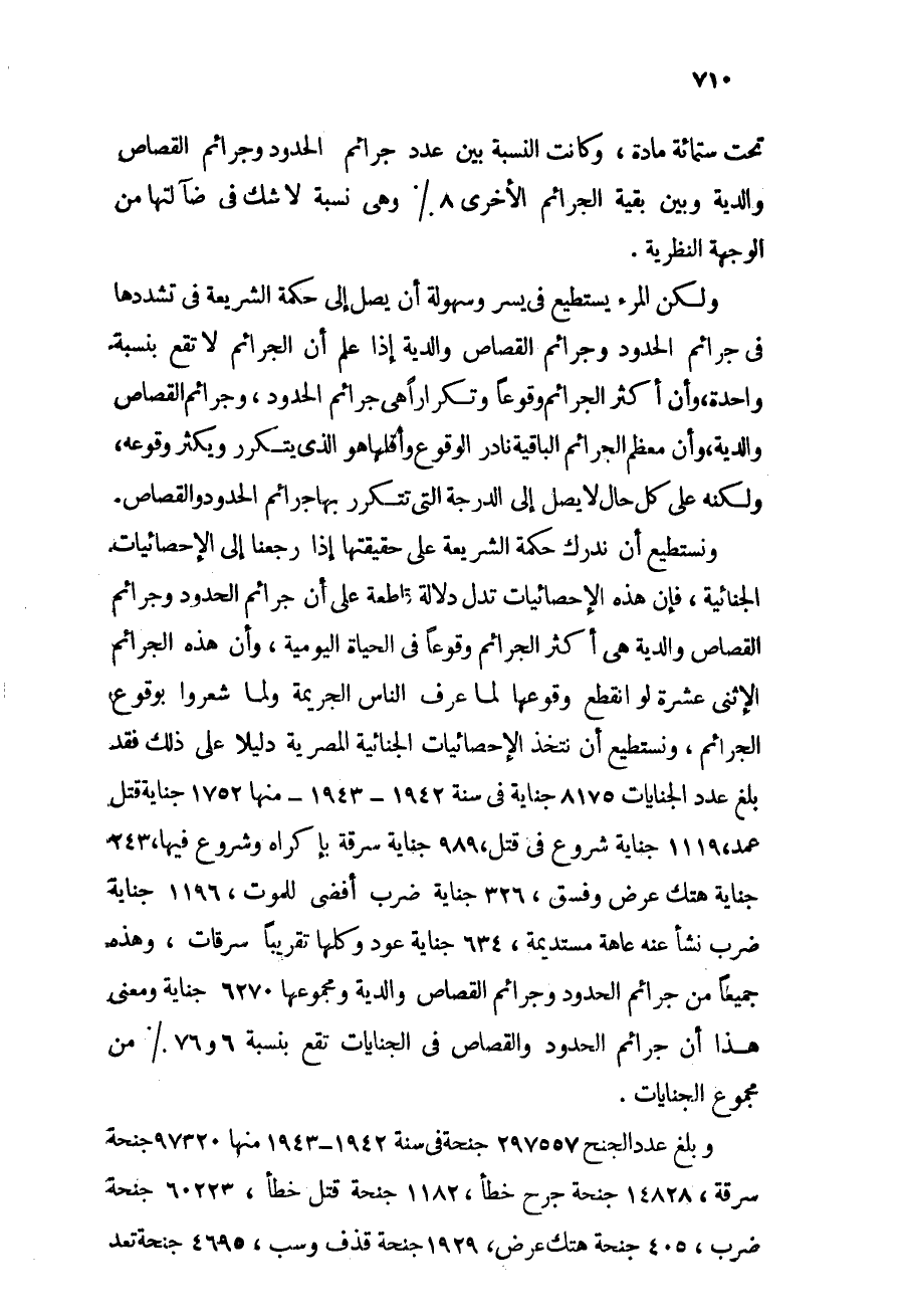 ونستطيع أن ندرك حكمة الشريعة على حقيقتها إذا رجعنا إلى الإحصائيات الجنائية، فإن هذه الإحصائيات تدل دلالة قاطعة على أن جرائم الحدود وجرائم القصاص والدية هي أكثر الجرائم وقوعاً في الحياة اليومية، وأن هذه الجرائم الاثنتى عشرة لو انقطع وقوعها لما عرف الناس الجريمة ولما شعروا بوقوع الجرائم، ونستطيع أن نتخذ الإحصائيات الجنائية المصرية دليلاً على ذلك، فقد بلغ عدد الجنايات 8175 جناية في سنة 1942 - 1943، منها 1752 جناية قتل عمد، 1119 جناية شروع في قتل، 989 جناية سرقة بإكراه وشروع فيها، 243 جناية هتك عرض وفسق، 326 جناية ضرب أفضى للموت، 1196 جناية ضرب نشأ عنه عاهة مستديمة، 634 جناية عود وكلها تقريباً سرقات، وهذه جميعاً من جرائم الحدود وجرائم القصاص والدية ومجموعها 6270 جناية، ومعنى هذا أن جرائم الحدود والقصاص في الجنايات تقع بنسبة 76.6} من مجموع الجنايات.