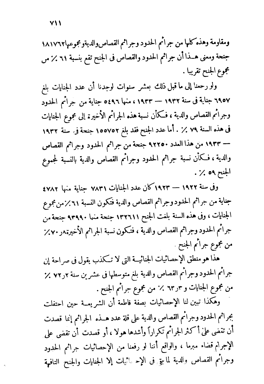 هذا هو منطق الإحصائيات الجنائية التي لا تكذب يقول في صراحة إن جرائم الحدود وجرائم القصاص والدية بلغ متوسطها في عشرين سنة 72.2} من مجموع الجنايات و63.3} من مجموع جرائم الجنح.