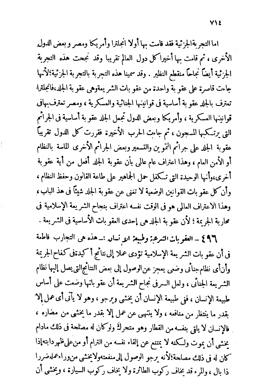496 - العقوبات الشرعية وطبيعة الإنسان: هذه هي التجارب قاطعة في أن عقوبات الشريعة الإسلامية تؤدي عملاً إلى نتائج أكيدة في كفاح الجريمة وأن أي نظام جنائي وضعي يعجز عن الوصول إلى بعض النتائج التي يصل إليها نظام الشريعة الجنائي, ولعل السر في نجاح الشريعة أن عقوباتها وضعت على أساس طبيعة الإنسان, ففي طبيعة الإنسان أن يخشى ويرجو, وهو لا يأتي أي عمل إلا بقد ما ينتظر من منافعه, ولا ينتهي عن عمل إلا بقد ما يخشى من مضاره, فالإنسان لا يلقي بنفسه من القطار وهو متحرك ولو كان له مصلحة في ذلكما دام يخشى أن يموت ولكنه لا يمتنع عن إلقاء نفسه من الترام أو من على ظهر دابته إذا كان له في ذلك مصلحة؛ لأنه يرجو الوصول إلى منفعته ولا يخشى من وراء عمله ضرراً ذا بال, والمرء قد يخاف ركوب الطائرة ولا يخاف ركوب السيارة, ويخشى أن