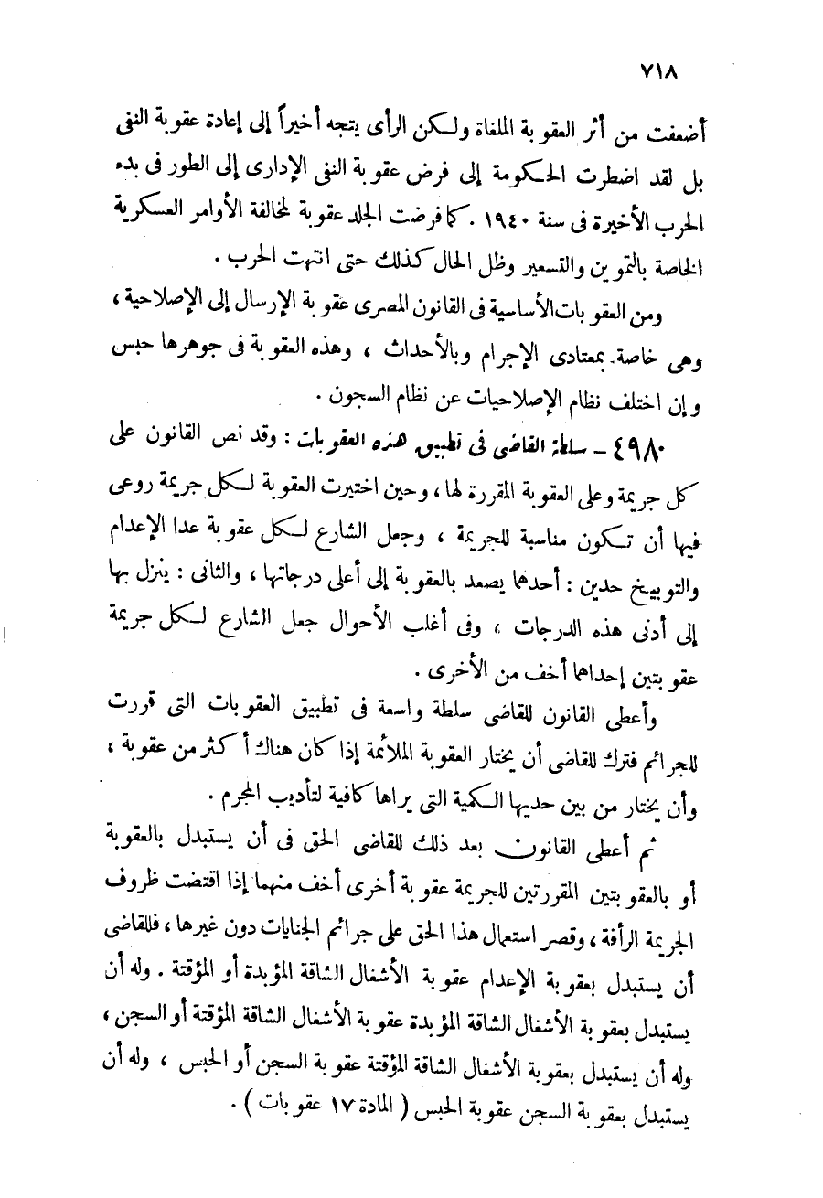أضعفت من أثر العقوبة الملغاه, ولكن الرأي يتجه أخيراً إلى إعادة عقوبة النفي, بل لقد اضطرت الحكومة إلى فرض عقوبة النفي الإداري إلى الطور في بدأ الحرب الأخيرة في سنة 1940, كما فرضت الجلد عقوبة لمخالفة الأوامر العسكرية الخاصة بالتموين والتسعير, وظل الحال كذلك حتى انتهت الحرب.