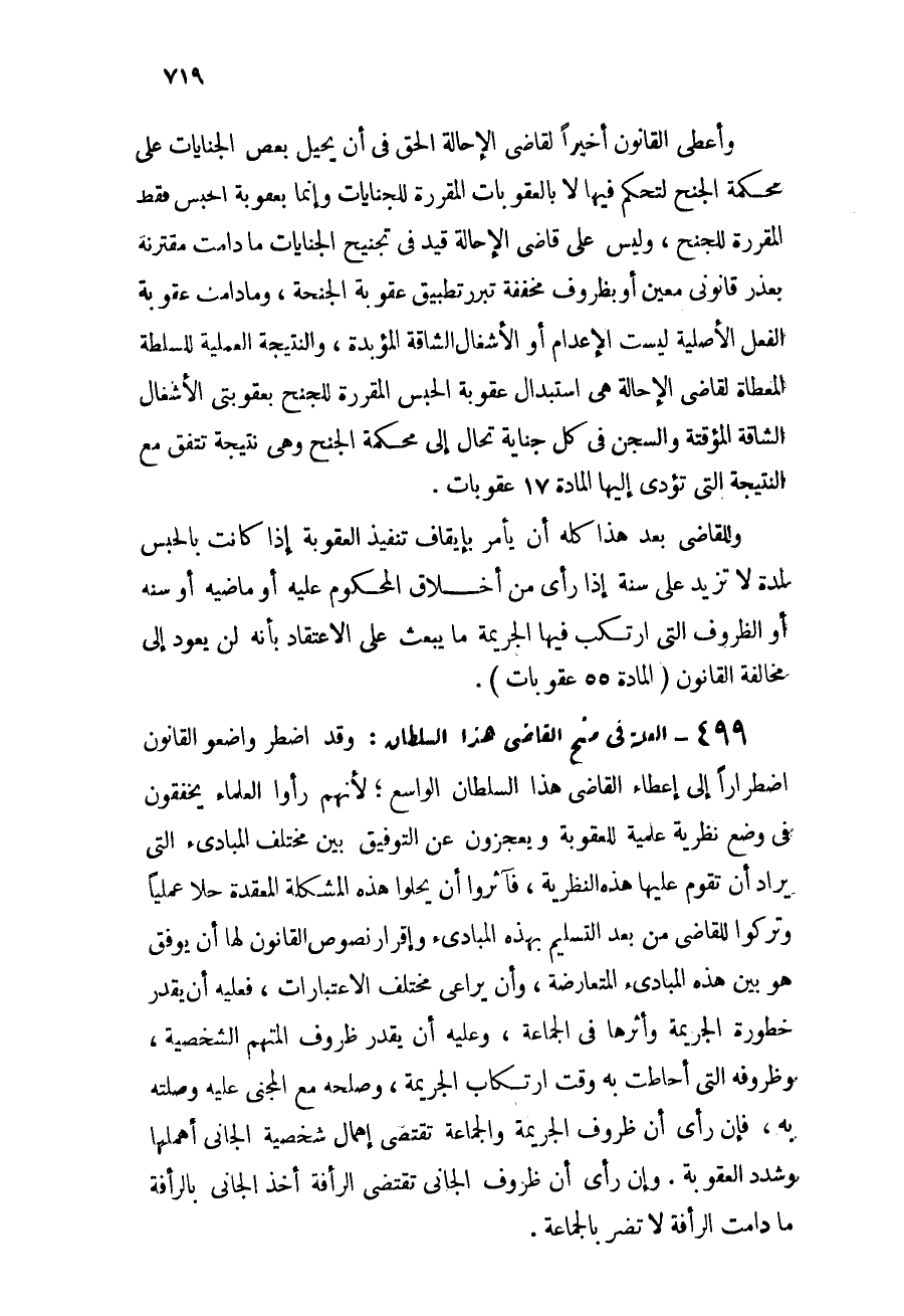 499 - العلة في منح القاضي هذا السلطان: وقد اضطر واضعو القانون اضطراراً إلى إعطاء القاضي هذا السلطان الواسع؛ لأنهم رأوا العلماء يخفقون في وضع نظرية علمية للعقوبة ويعجزون عن التوفيق بين مختلف المبادئ التي يراد أن تقوم عليها هذه النظرية, فآثروا أن يحلوا هذه المشكلة المعقدة حلاً عملياً وتركوا للقاضي من بعد التسليم بهذه المبادئ وإقرار نصوص القانون لها أن يوفق هو بين هذه المبادئ المتعارضة, وأن يراعى مختلف الاعتبارات, فعليه أن يقدر خطورة الجريمة وأثرها في الجماعة, وعليه أن يقدر ظروف المتهم الشخصية, وظروفه التي أحاطت به وقت ارتكاب الجريمة, وصلحه مع المجني عليه وصلته به, فإن رأى أن ظروف الجريمة والجماعة تقتضي إهمال شخصية الجاني أهملها وشدد العقوبة. وإن رأى أن ظروف الجاني تقتضي الرأفة أخذ الجاني بالرأفة ما دامت الرأفة لا تضر بالجماعة.