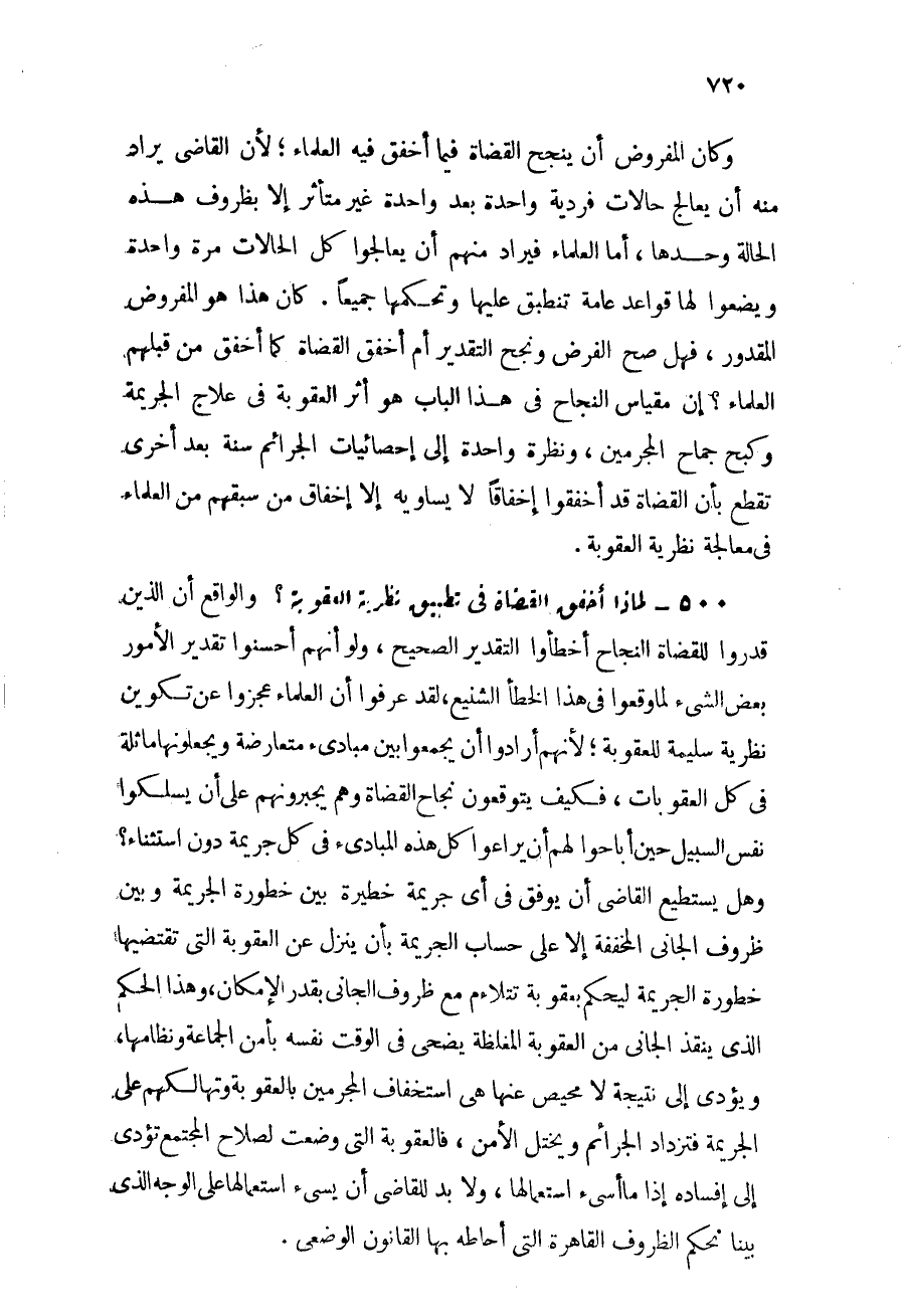 وكان الفروض أن ينجح القضاة فيما أخفق فيه العلماء؛ لأن القاضي يراد منه أن يعالج حالات فردية واحدة بعد واحدة غير متأثر إلا بظروف هذه الحالة وحدها, أما العلماء فيراد منهم أن يعالجوا كل الحالات مرة واحدة ويضعوا لها قواعد تنطبق عامة عليها وتحكمها جميعاً. كان هذا هو المفروض المقدور, فهل صح الفرض ونجح التقدير أم أخفق القضاة كما أخفق من قبلهم العلماء؟ إن مقياس النجاح في هذا الباب هو أثر العقوبة في علاج الجريمة وكبح جماح المجرمين, ونظرة واحدة إلى إحصائيات الجرائم سنة بعد أخرى تقطع بأن القضاة قد أخفقوا إخفاقاً لا يساويه إلا إخفاق من سبقهم من العلماء في معالجة نظرية العقوبة.