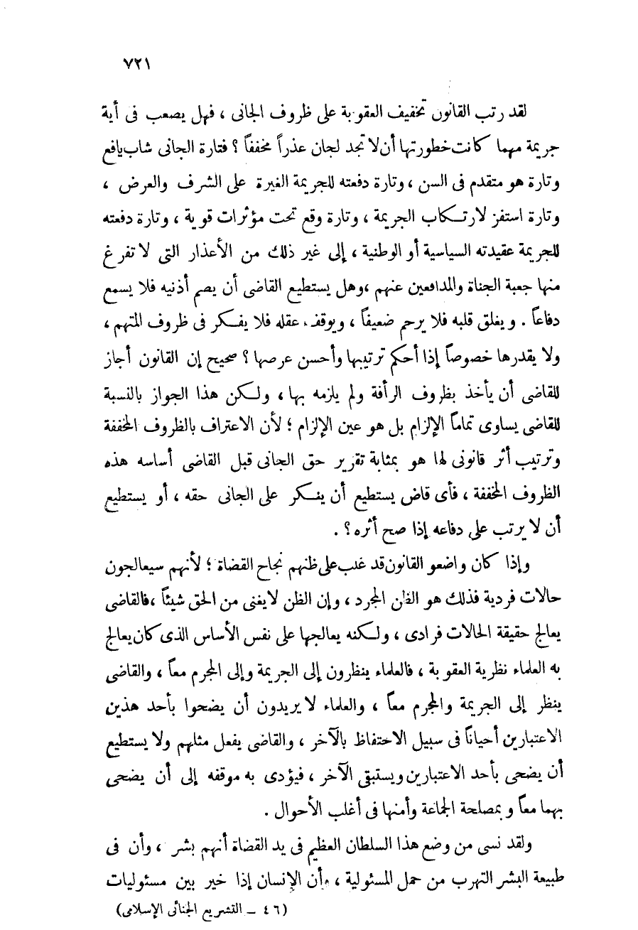 وإذا كان واضعو القانون قد غلب على ظنهم نجاح القضاة؛ لأنهم سيعالجون حالات فردية فذلك هو الظن المجرد, وإن الظن لا يغني من الحق شيئاً, فالقاضي يعالج حقيقة حالات فرادى، ولكنه يعالجها على نفس الأساس الذي كان يعالج به العلماء نظرية العقوبة, فالعلماء ينظرون إلى الجريمة وإلى المجرم معاً, والقاضي ينظر إلى الجريمة والمجرم معاً, والعلماء لا يريدون أن يضحوا بأحد هذين الاعتبارين أحياناً في سبيل الاحتفاظ بالآخر, والقاضي يفعل مثلهم ولا يستطيع أن يضحي بأحد الاعتبارين ويستبقي الآخر, فيؤدي به موقفه إلى أن يضحي بهما معاً وبمصلحة الجماعة وأمنها في أغلب الأحوال.