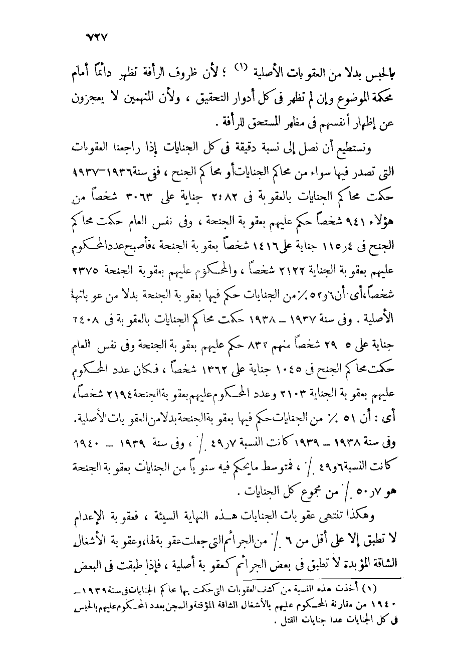 (¬1) أخذت هذه النسبة من كشف العقوبات التي حكمت بها محاكم الجنايات في سنة 1939- 1940 من مقارنة المحكوم عليهم بالأشغال الشاقة المؤقتة والسجن بعدد المحكوم عليهم بالحبس في كل الجنايات عدا جنايات القتل.
