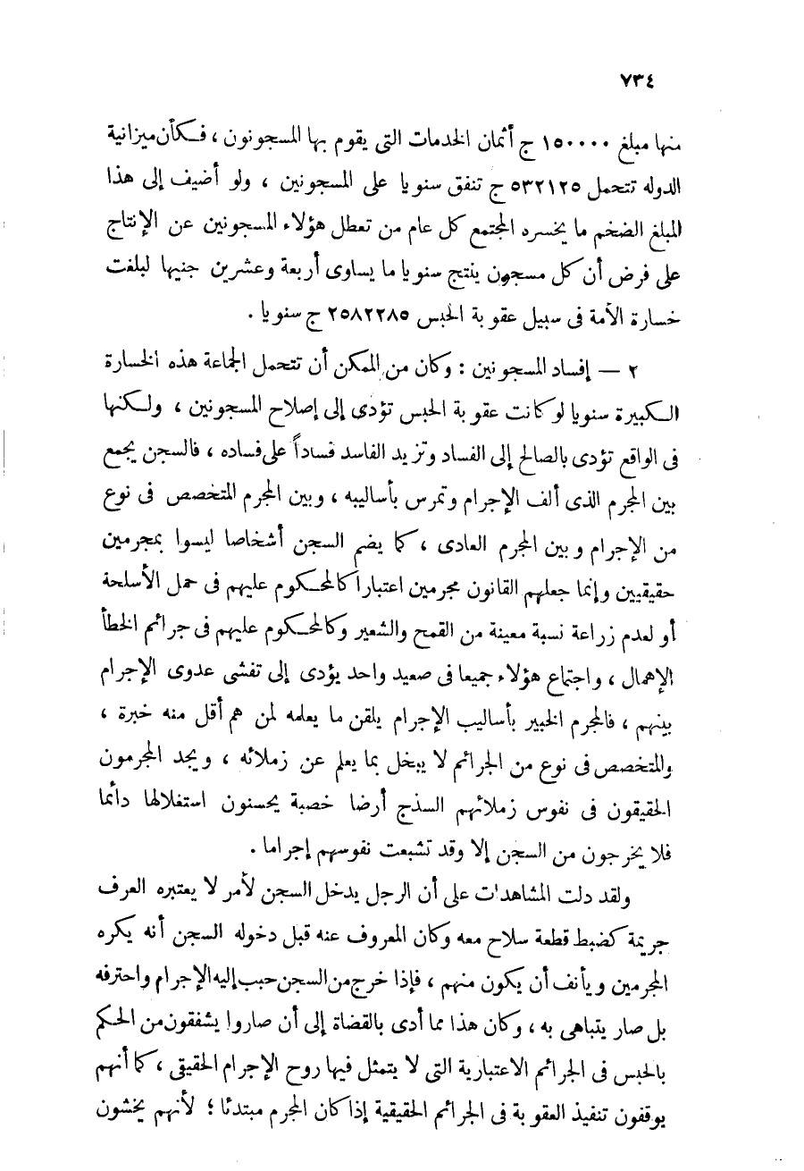 منها مبلغ 150000ج أثمان الخدمات التي يقوم بها المسجونون, فكأن ميزانية الدولة تتحمل 532125ج تنفق سنوياً على المسجونين, ولو أضيف إلى هذا المبلغ الضخم ما يخسره المجتمع كل عام من تعطل هؤلاء المسجونين عن الإنتاج على فرض أن كل مسجون ينتج سنوياً ما يساوي أربعة وعشرين جنيهاً لبلغت خسارة الأمة في سبيل عقوبة الحبس 2582285ج سنوياً.