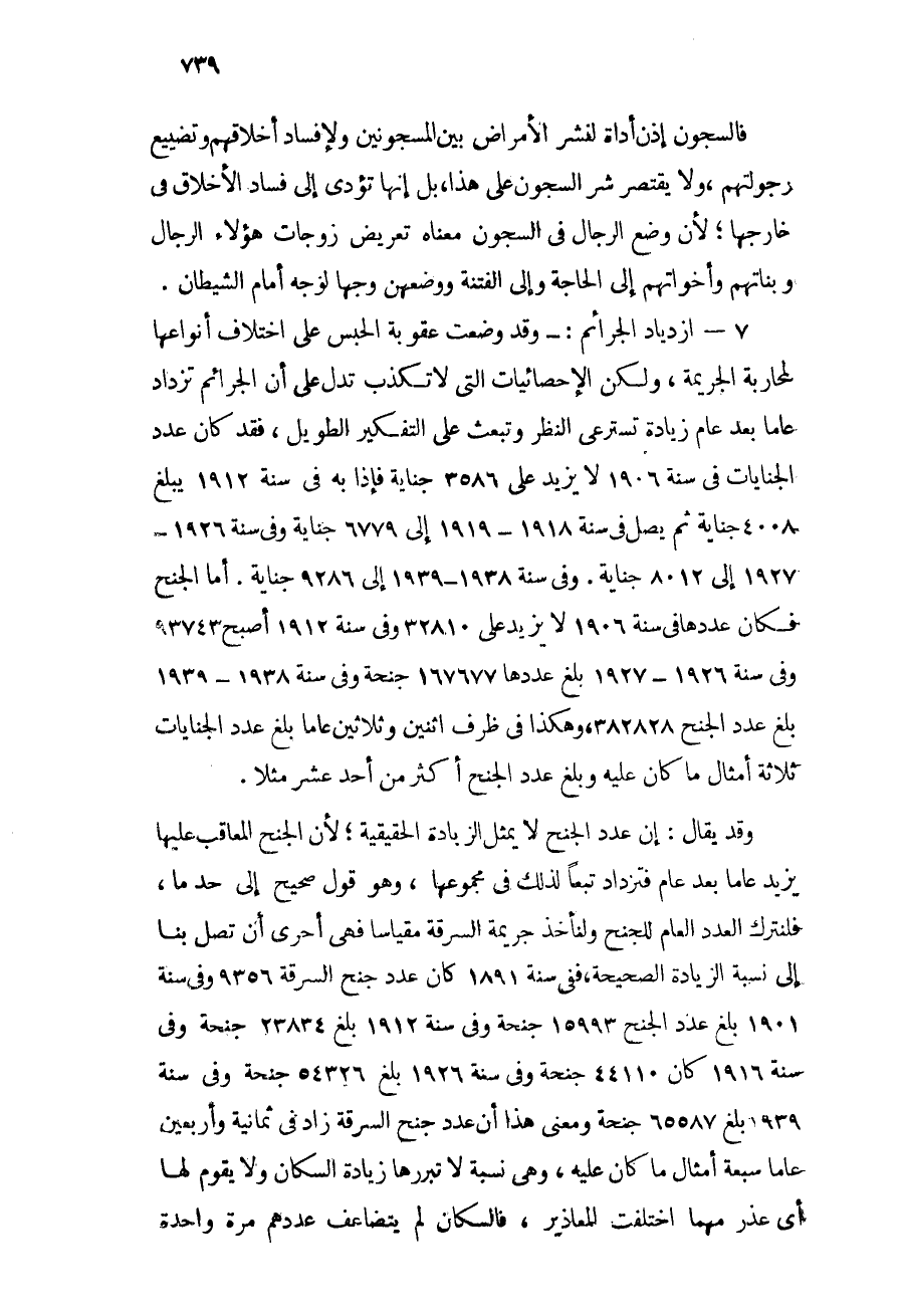 وقد يقال: إن عدد الجنح لا يمثل الزيادة الحقيقية؛ لأن الجنح المعاقب عليها يزيد عاماً بعد عام فتزداد تبعاً لذلك في مجموعها, وهو قول صحيح إلى حد ما, فلنترك العدد العام للجنح ولنأخذ جريمة السرقة مقياساً فهي أحرى أن تصل بنا إلى نسبة الزيادة الصحيحة, ففي سنة 1991 كان عدد جنح السرقة 9356, وفي سنة 1901 بلغ عدد الجنح 15993 جنحة, وفي سنة 1912 بلغ 23834 جنحة, وفي سنة 1916 بلغ 44110, وفي سنة 1926 بلغ 54326 جنحة, وفي سنة 1939 بلغ 65587 جنحة. ومعنى هذا أن عدد جنح السرقة زاد في ثمانية وأربعين عاماً سبعة أمثال ما كان عليه, وهي نسبة لا تبررها زيادة السكان ولا يقوم بها أي عذر مهما اختلفت المعازير, فالسكان لم يتضاعف عددهم مرة واحدة