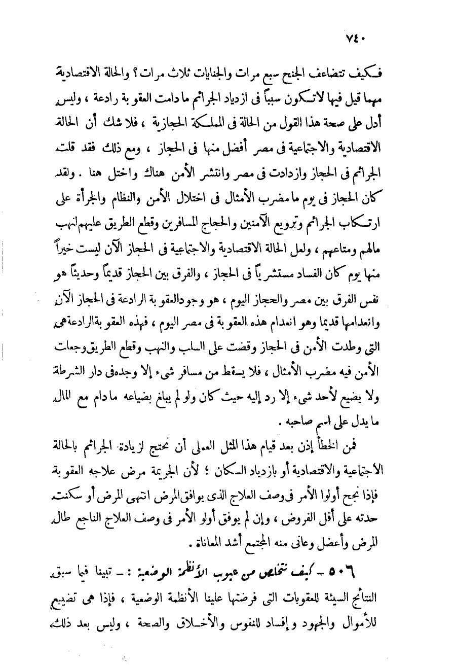 ولقد كان الحجاز في يوم ما مضرب الأمثال في اختلال الأمن والنظام والجرأة على ارتكاب الجرائم وترويع الآمنين والحجاج المسافرين وقطع الطرق عليهم لنهب مالهم ومتاعهم, ولعل الحالة الاقتصادية والاجتماعية في الحجاز الآن ليست خيراً منها يوم كان الفساد مستشرياً في الحجاز, والفرق بين الحجاز قديماً وحديثاً وهو نفس الفرق بين مصر والحجاز اليوم, هو وجود العقوبة الرادعة في الحجاز الآن وانعدام هذه العقوبة في مصر اليوم, فهذه العقوبة الرادعة هي التي وطدت الأمن في الحجاز وقضت على السلب والنهب وقطع الطريق وجعلت الأمن فيه مضرب الأمثال, فلا يسقط من مسافر شئ إلا وجده دار الشرطة, ولا يضيع لأحد شيء إلا رد إليه حيث كان ولو لم يبلغ بضياعه ما دام مع المال ما يدل على اسم صاحبه.