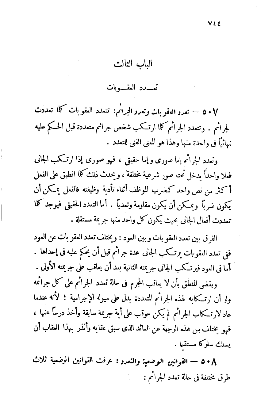 507 - تعدد العقوبات وتعدد الجرائم: تتعدد العقوبات كلما تعددت الجرائم, وتتعدد الجرائم كلما ارتكب شخص جرائم متعددة قبل الحكم عليه نهائياً في واحدة منها, وهذا هو المعنى الفني للتعدد.