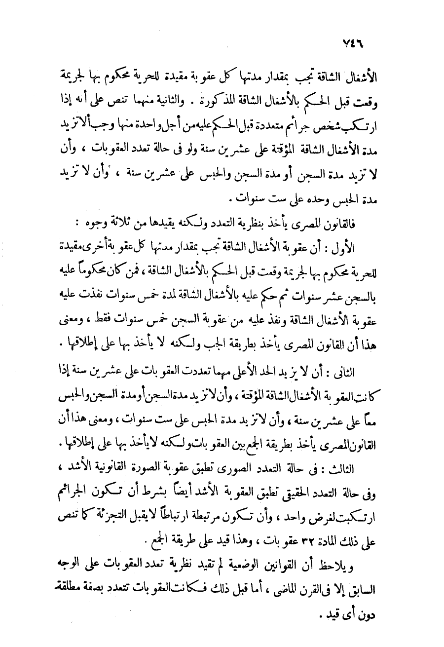 الثاني: أن لا يزيد الحد الأعلى مهما تعددت العقوبات على عشرين سنة إذا كانت العقوبة الأشغال الشاقة المؤقتة, وأن لا يزيد مدة السجن أو مدة السجن والحبس معاً على عشرين سنة, وأن لا تزيد مدة الحبس على ست سنوات, ومعنى هذا أن القانون المصري يأخذ بطريقة الجمع بين العقوبات ولكنه لا يأخذ بها على إطلاقها.