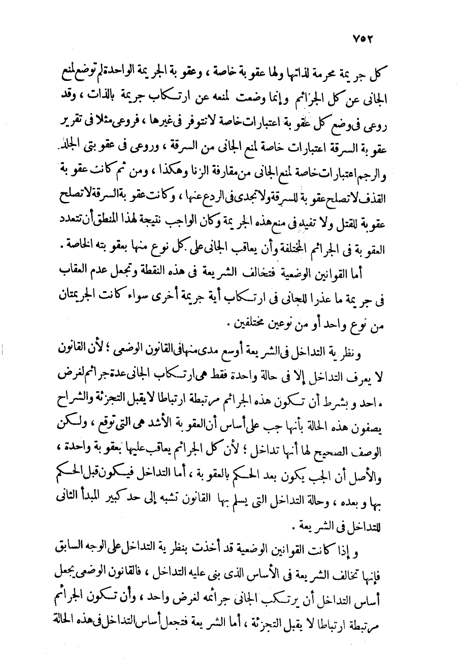 كل جريمة محرمة لذاتها ولها عقوبة خاصة, وعقوبة الجريمة الواحدة لم توضع لمنع الجاني عن كل الجرائم وإنما وضعت لمنعه عن ارتكاب جريمة بالذات, وقد روعي في وضع كل عقوبة اعتبارات خاصة لا تتوفر في غيرها, فروعي مثلاً في تقرير عقوبة السرقة اعتبارات خاصة لمنع الجاني من السرقة, وروعي في عقوبتي الجلد والرجم اعتبارات خاصة لمنع الجاني من مقارفة الزنا, وهكذا. ومن ثم كانت عقوبة القذف لا تصلح عقوبة للسرقة ولا تجدي في الردع عنها, وكانت عقوبة السرقة لا تصلح عقوبة للقتل ولا تفيد في منع هذه الجريمة, وكان الواجب نتيجة لهذا المنطق أن تتعدد العقوبة في الجرائم المختلفة وأن يعاقب الجاني على كل نوع منها بعقوبته الخاصة.