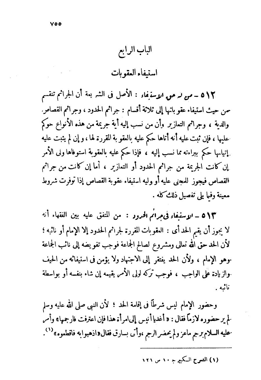 513 - الاستيفاء في جرائم الحدود: من المتفق عليه بين الفقهاء أنه لا يجوز أن يقيم الحد - أي العقوبات المقررة لجرائم الحدود - إلا الإمام أو نائبه؛ لأن الحد حق الله تعالى ومشروع لصالح الجماعة فوجب تفويضه إلى نائب الجماعة وهو الإمام، ولأن الحد يفتقر إلى الاجتهاد ولا يؤمن في استيفائه من الحيف والزيادة على الواجب، فوجب تركه لولي الأمر يقيمه إن شاء بنفسه أو بواسطة نائبه.