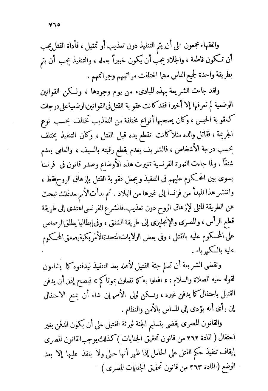 ولقد جاءت الشريعة بهذه المبادئ من يوم وجودها، ولكن القوانين الوضعية لم تعرفها إلا أخيراً، فقد كانت عقوبة القتل في القوانين الوضعية على درجات كعقوبة الحبس، وكان يصحبها أنواع مختلفة من التعذيب تختلف بحسب نوع الجريمة، فقاتل والده مثلاً كانت تقطع يده قبل القتل، وكان التنفيذ يختلف بحسب درجة الأشخاص، فالشريف يعدم بقطع رقبته بالسيف، والعامي يعدم شنقاً.