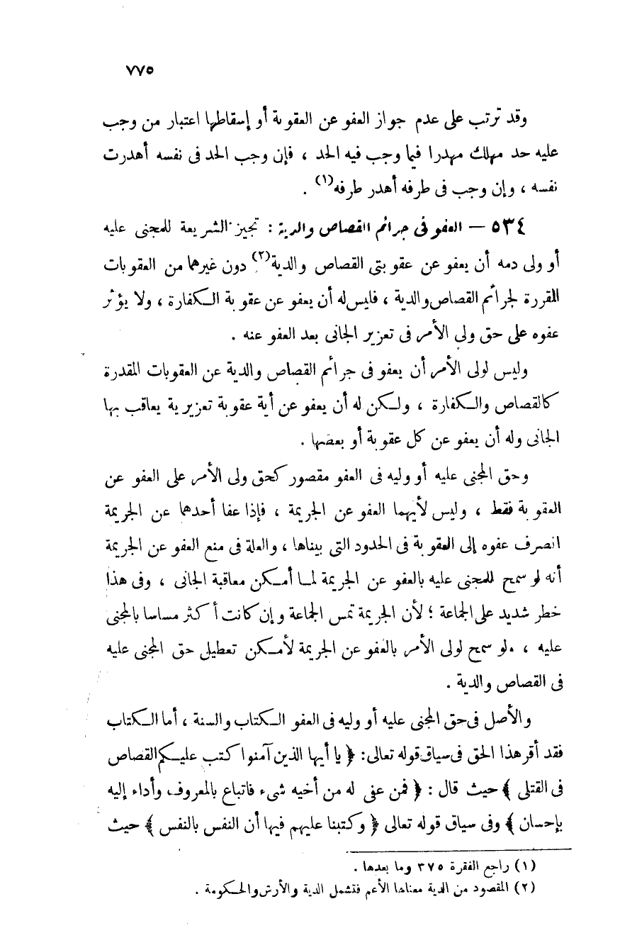 534 - العفو في جرائم القصاص والدية: تجيز الشريعة للمجني عليه أو ولي دمه أن يعفو عن عقوبتي القصاص والدية (¬2) دون غيرهما من العقوبات المقررة لجرائم القصاص والدية، فليس له أن يعفو عن عقوبة الكفارة, ولا يؤثر عفوه على حق ولي الأمر في تعزير الجاني بعد العفو عنه.