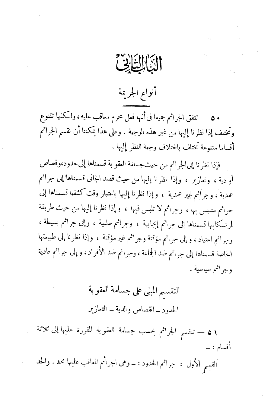 القسم الأول: جرائم الحدود: وهي جرائم المعاقب عليها بحد. والحد