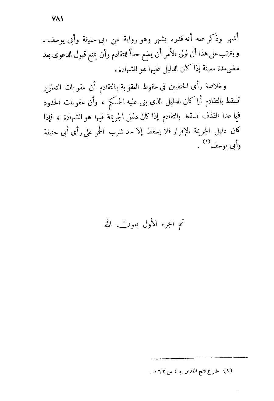 وخلاصة رأي الحنفيين في سقوط العقوبة بالتقادم أن عقوبات التعازير تسقط بالتقادم أياً كان الدليل الذي بني عليه الحكم, وأن عقوبات الحدود فيما عدا القذف تسقط بالتقادم إذا كان دليل الجريمة فيها هو الشهادة, فإذا كان دليل الجريمة الإقرار فلا يسقط إلا حد شرب الخمر على رأي أبي حنيفة وأبي يوسف (¬1) .