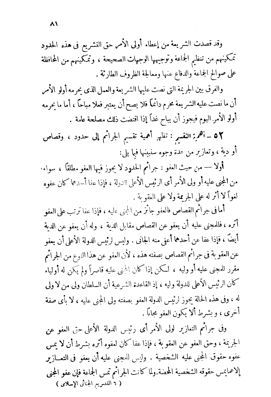52 - أهمية هذا التقسيم: تظهر أهمية تقسيم الجرائم إلى حدود، وقصاص أو دية، وتعازير، من عدة وجوه سنبينها فيما يلي: