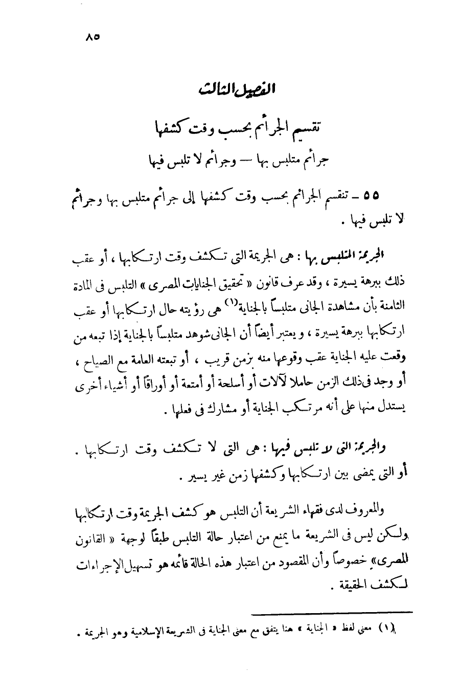 55 - تنقسم الجرائم بحسب وقت كشفها إلى جرائم متلبس بها وجرائم لا تلبس فيها.