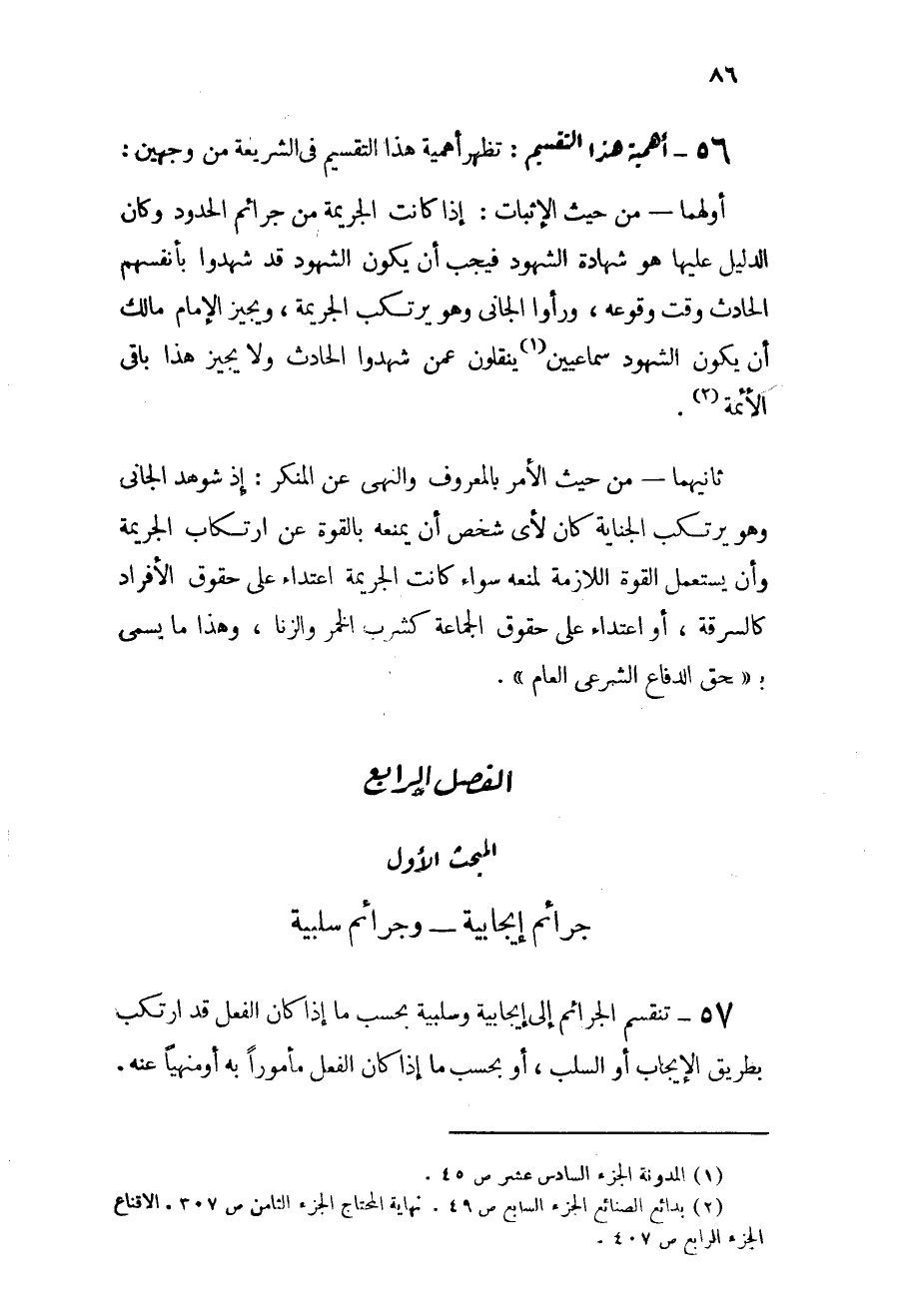 57 - تنقسم الجرائم إلى إيجابية وسلبية: بحسب ما إذا كان الفعل قد ارتكب بطريق الإيجاب أو السلب، أو بحسب ما إذا كان الفعل مأموراً به أو منهياً عنه.
