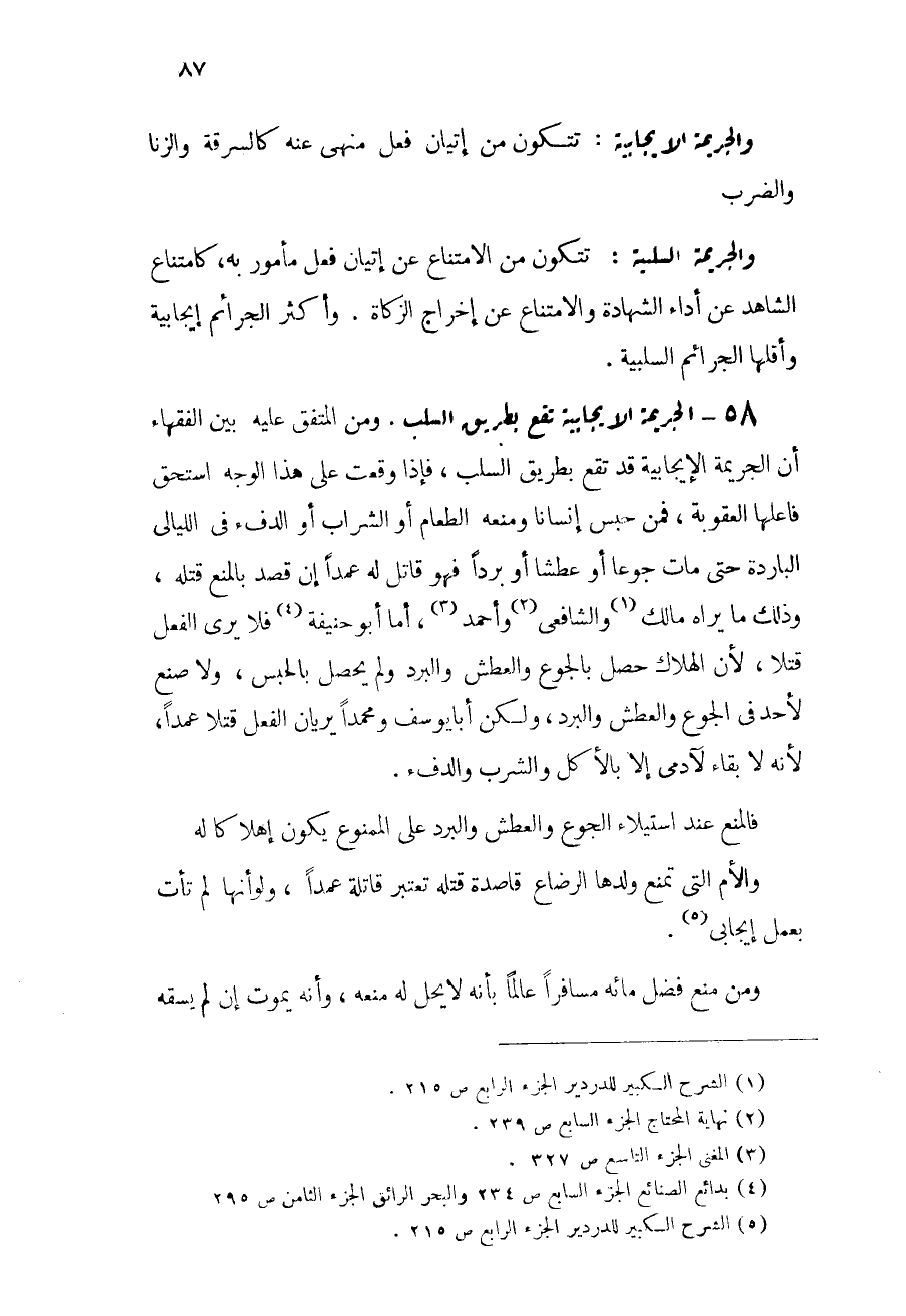58 - الجريمة الإيجابية تقع بطريق السلب: ومن المتفق عليه بين الفقهاء أن الجريمة الإيجابية قد تقع بطريق السلب، فإذا وقعت على هذا الوجه استحق فاعلها العقوبة، فمن حبس إنساناً ومنعه الطعام أو الشراب أو الدفء في الليالي الباردة حتى مات جوعاً أو عطشاً أو برداً فهو قاتل عمداً إن قصد بالمنع قتله، وذلك ما يراه مالك (¬1) والشافعي (¬2) وأحمد (¬3) ، أما أبو حنيفة (¬4) فلا يرى الفعل قتلاً، لأن الهلاك حصل بالجوع والعطش والبرد ولم يحصل بالحبس، ولا صنع لأحد في الجوع والعطش والبرد، ولكن أبا يوسف ومحمداً يريان الفعل قتلاً عمداً، لأنه لا بقاء لآدمي إلا بالأكل والشرب والدفء. فالمنع عند استيلاء الجوع والعطش والبرد على الممنوع يكون إهلاكاً له.