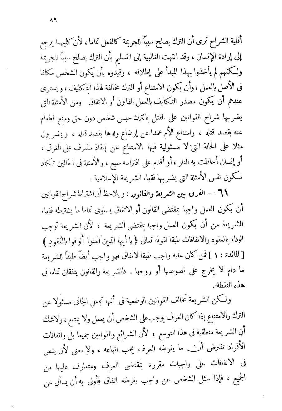 61 - الفرق بين الشريعة والقانون: ويلاحظ أن اشتراط شراح القوانين أن يكون العمل واجباً بمقتضى القانون أو الاتفاق يساوي تماماً ما يشترطه فقهاء الشريعة من أن يكون العمل واجباً بمقتضى الشريعة، لأن الشريعة توجب الوفاء بالعقود والاتفاقات طبقاً لقوله تعالى: {يَا أَيُّهَا الَّذِينَ آمَنُواْ أَوْفُواْ بِالْعُقُودِ} [المائدة: 1] ، فمن كان عليه واجب طبقاً لاتفاق فهو واجب أيضاً طبقاً للشريعة ما دام لا يخرج على نصوصها أو روحها فالشريعة والقانون يتفقان تماماً في هذه النقطة.