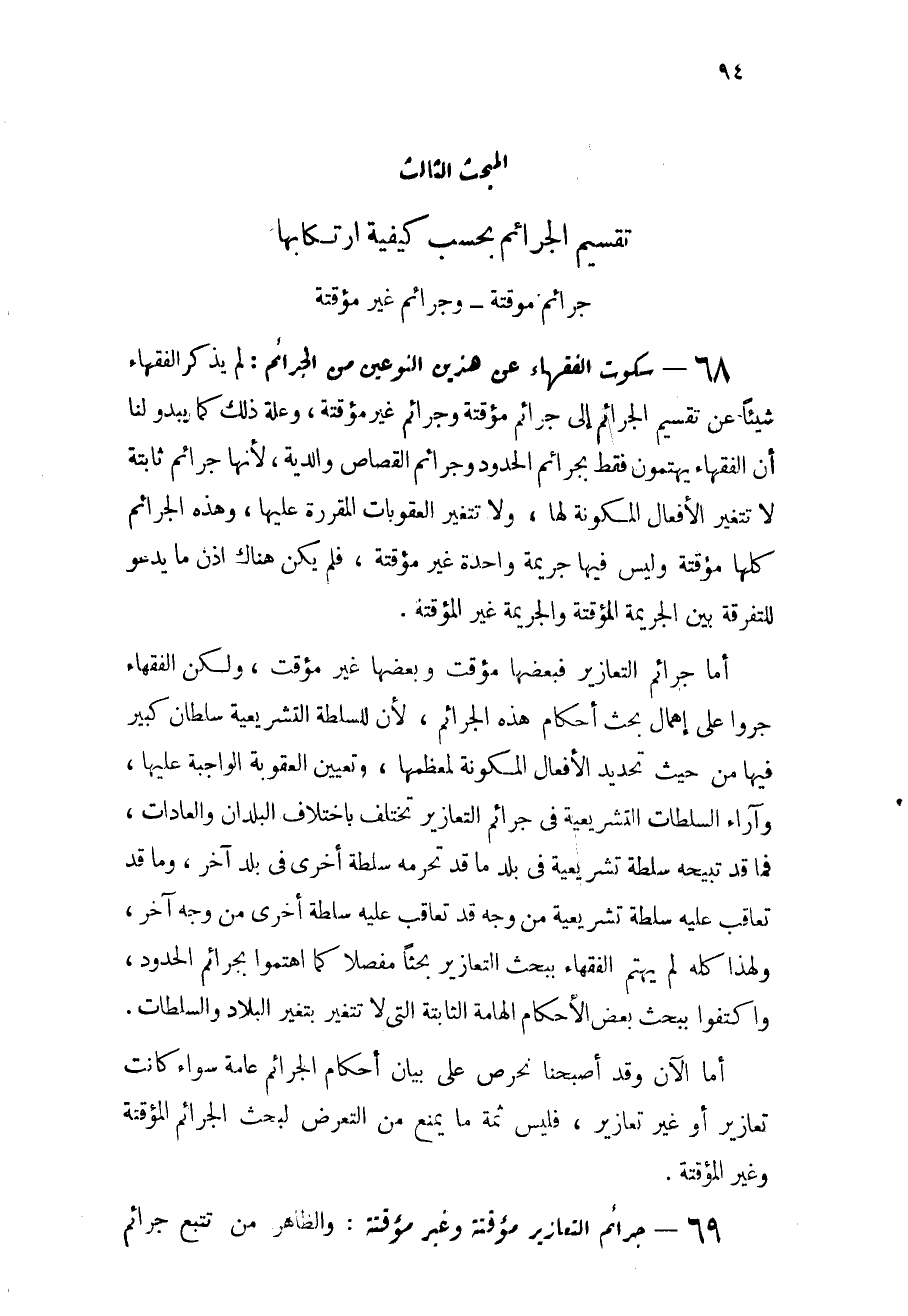 68 - سكوت الفقهاء عن هذين النوعين من الجرائم: لم يذكر الفقهاء شيئاً عن تقسيم الجرائم إلى جرائم مؤقتة وجرائم غير مؤقتة، وعلة ذلك - كما يبدو لنا - أن الفقهاء يهتمون فقط بجرائم الحدود وجرائم القصاص والدية، لأنها جرائم ثابتة لا تتغير الأفعال المكونة لها، ولا تتغير العقوبات المقررة عليها، وهذه الجرائم كلها مؤقتة وليس فيها جريمة واحدة غير مؤقتة، فلم يكن هناك إذن ما يدعو للتفرقة بين الجريمة المؤقتة والجريمة غير المؤقتة.